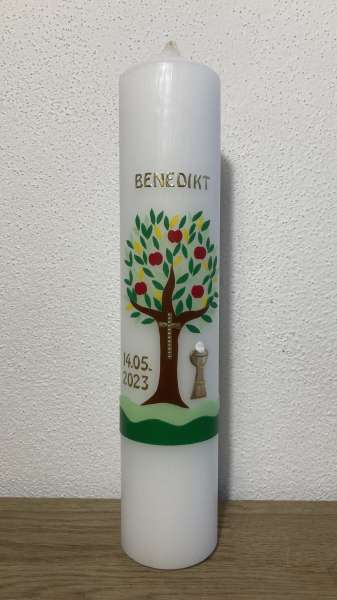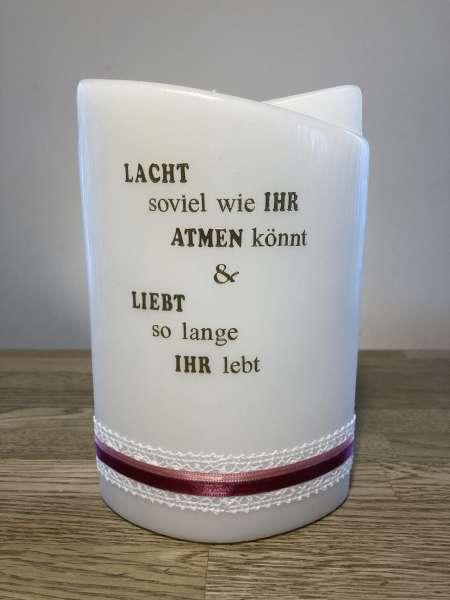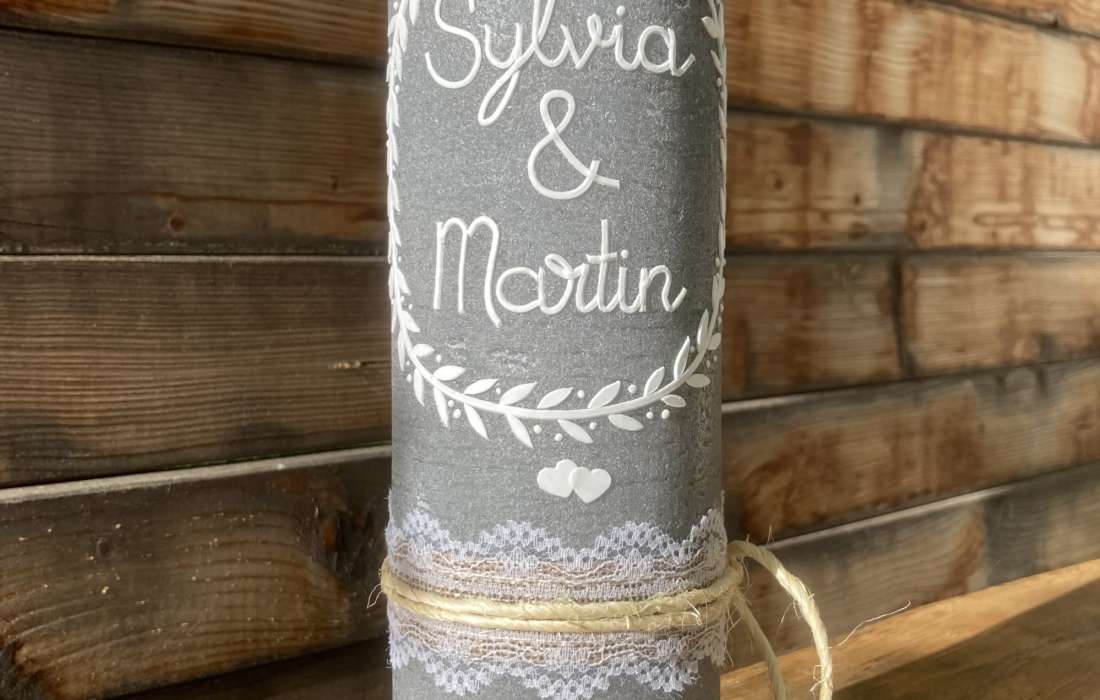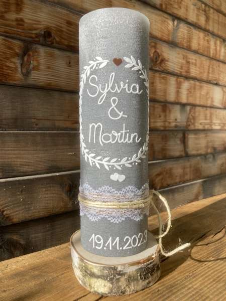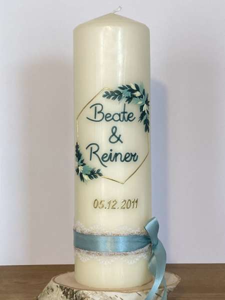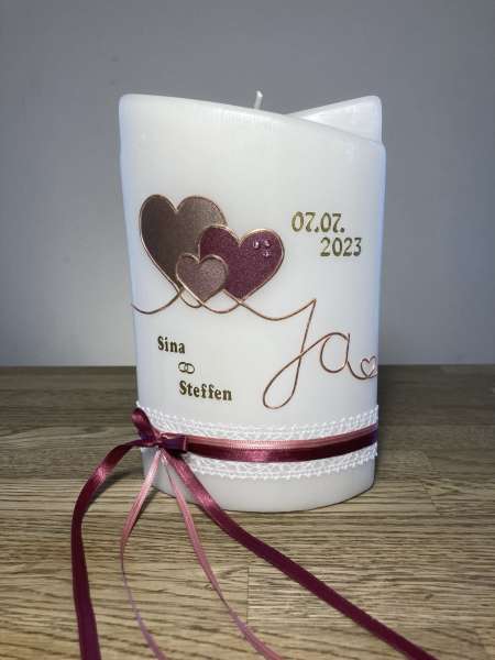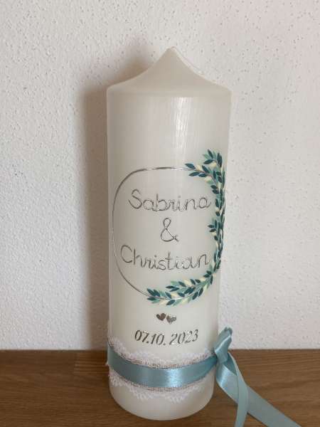 Eine klassische Kerze in weiß, oder farblich angepasst wie bei den Rustikakerzen. Mit Spitzenband und Schleife oder rustikaler mit Juteschnur. Alles ist möglich.