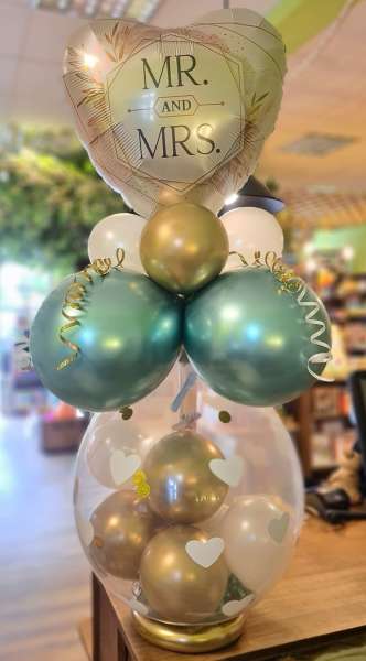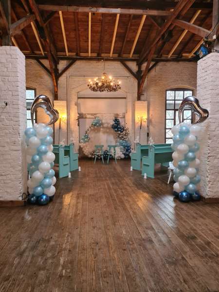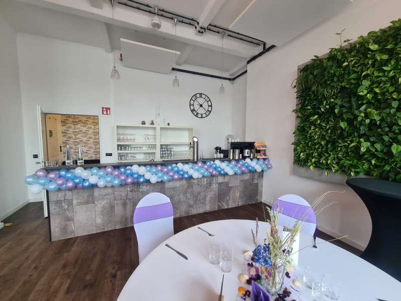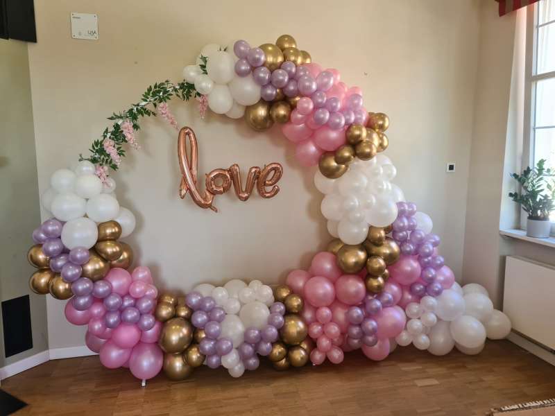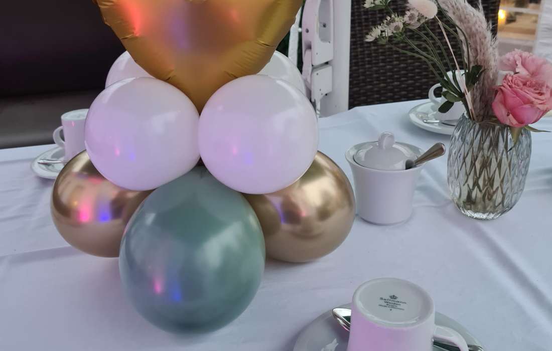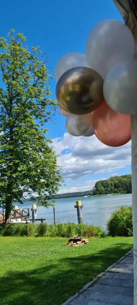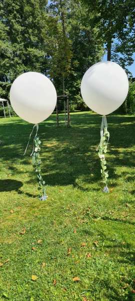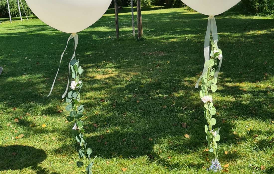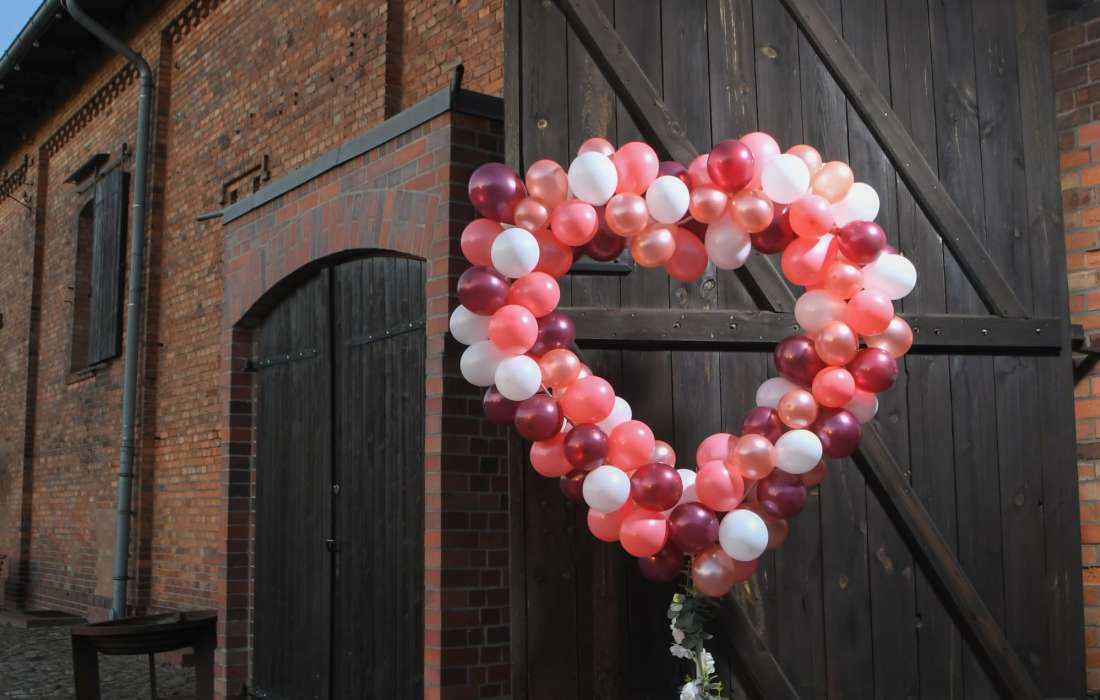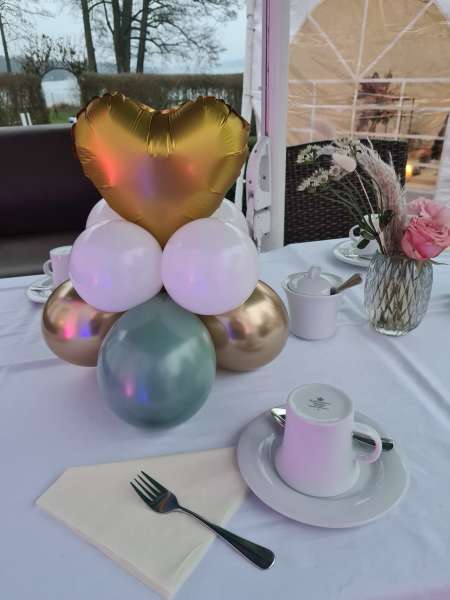 Hier ist alles möglich, von Ballonbouqets oder Ballongirlanden im Eingangsbereich, Tischdeko oder fliegende Herzballons oder aber auch ein stilvolles Ballonherz am Traualtar und einen schönen Fotohintergrund mit Ballons.