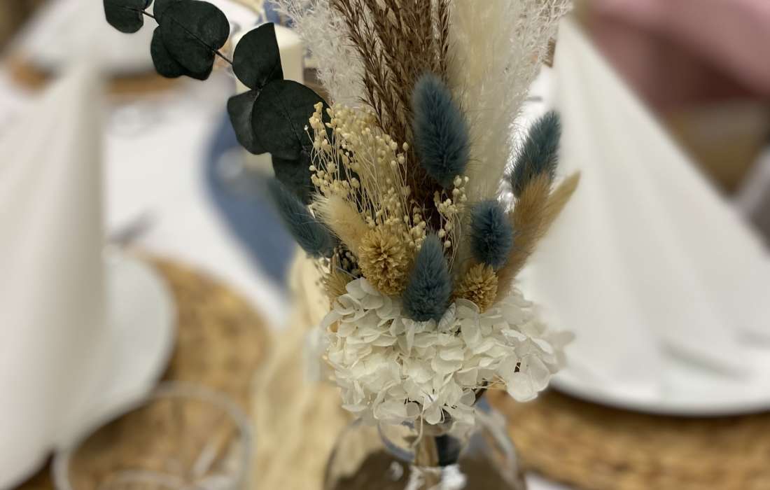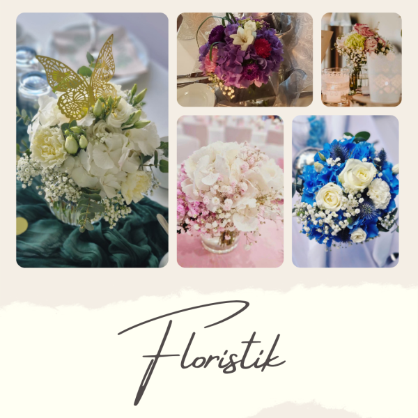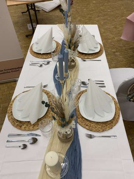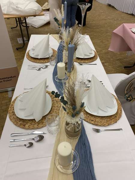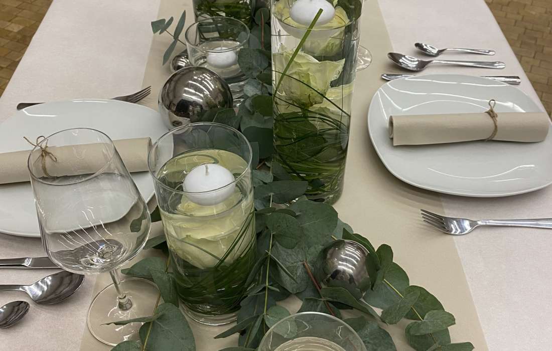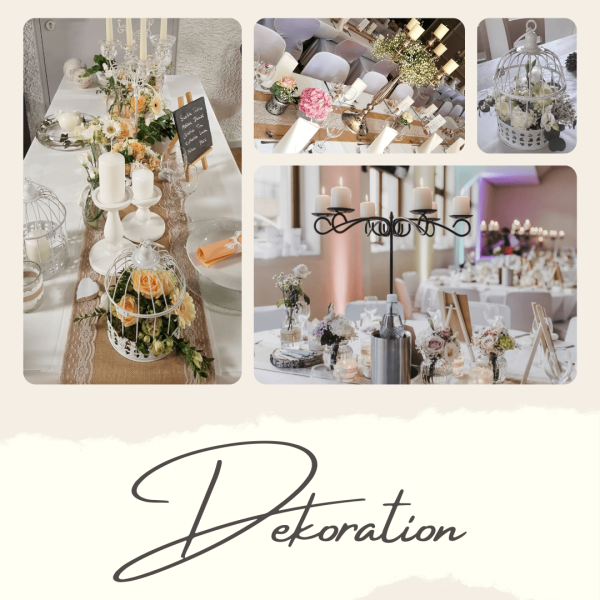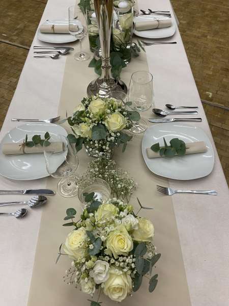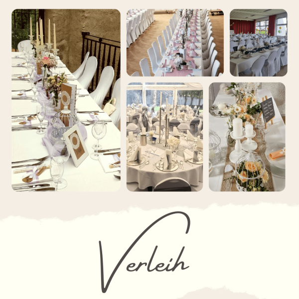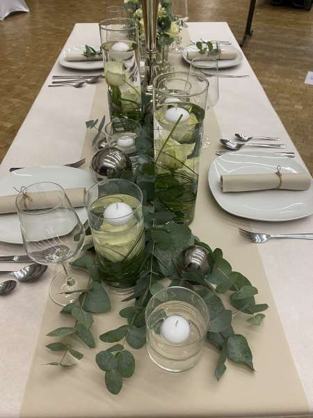 Von der Tischdecke, über die Blumen und die Kerzen, bis hin zu den Tischkarten und den Stuhlhussen, ich kümmere mich um alles. Selbst Tische, Besteck und Gläser können bei mir gemietet werden.