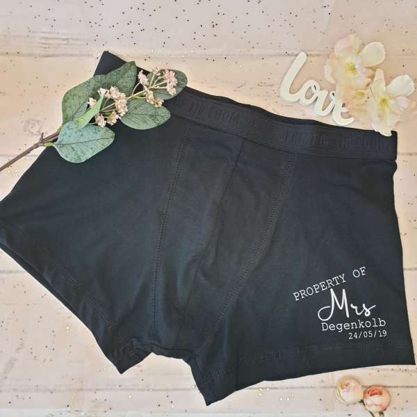 → Finde personalisierte Produkte für den Bräutigam wie Hochzeitssocken oder Boxershorts.