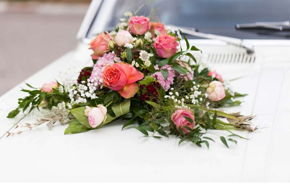 Ein wichtiger Bestandteil einer jeden Hochzeit ist der Blumenschmuck. Art und Stil der Blumen im Brautstrauß, sind richtungsweisend für die Gestaltung der Blumendeko für Brautwagen, Kirche, Saal und Tische.