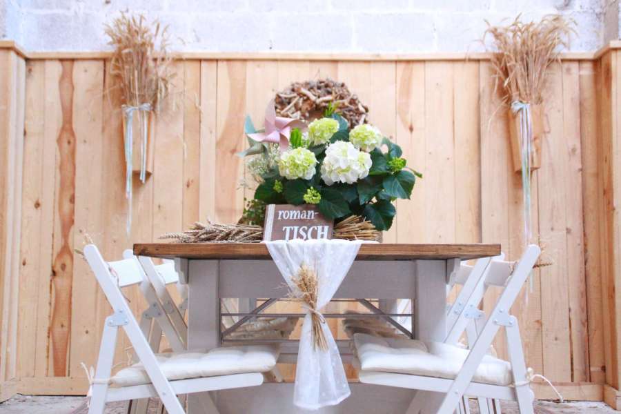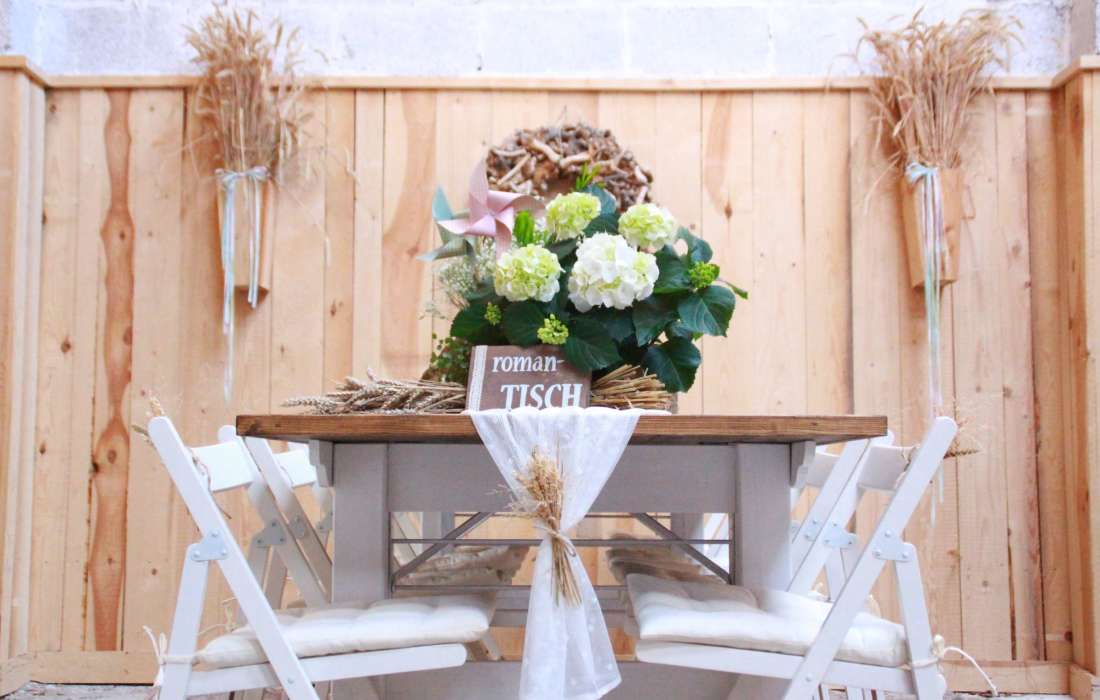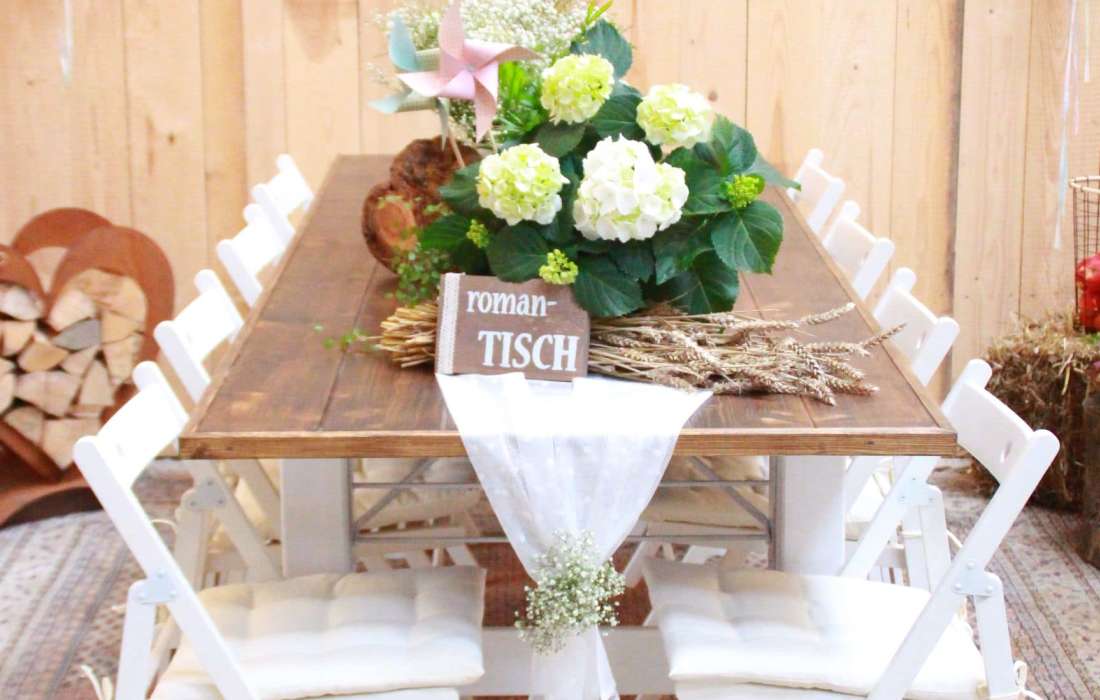 Verleih von Tischen, Stühlen & Deko im rustikalen Vintage-Stil