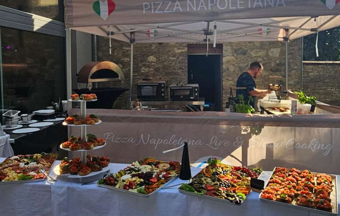 Vor den Augen eurer Gäste backen wir neapolitanische Pizzen bei 450 °C. Jede Pizza wird frisch aus erstklassigen italienischen Zutaten zubereitet und stilvoll auf Servierbrettern präsentiert. Das duftende Pizzabuffet wird laufend aufgefüllt, sodass alle gleichzeitig genießen können.