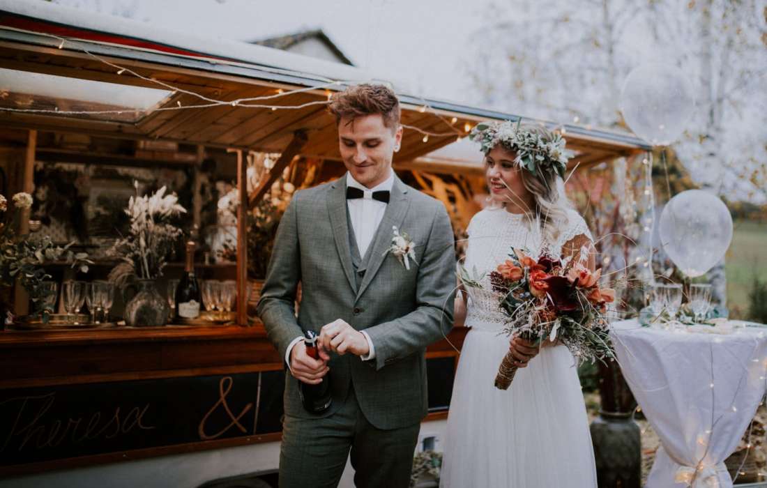 Bis zu 200 Personen Servieren wir frisch gekühlten Prosecco auf Wunsch gerne auch Kaffee dazu. Vor unserem Caravan stehen Stehtische um Euren Gäste zum verweilen einzuladen und viele Erinnerung nach eurer Trauung zu knipsen.