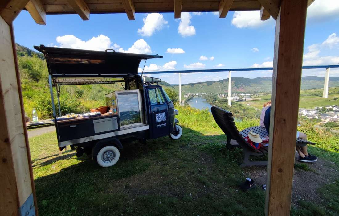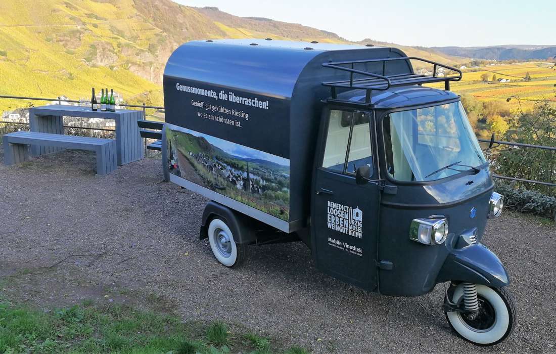 Das vinophile Schätzchen, eine zur mobilen Vinothek umgebaute Piaggio Ape, ist ein Eyecatcher, optisch ist sie ein Hingucker und da alles praktisch verfügbar ist, ist sie gut geeignet für den flexiblen mobilen Genuss von Rieslingen aus den Steilstlagen rund um Ürzig.