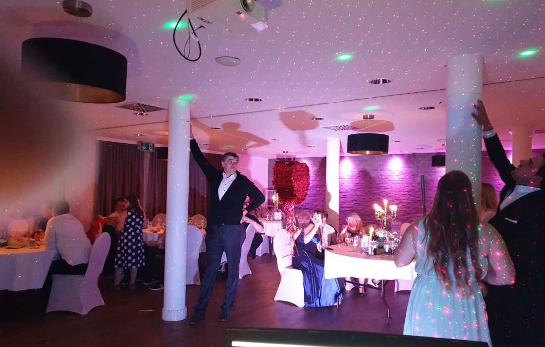 | Besonderheiten / Zusatzleistungen | Professionelle Musik- & Lichtanlage ( einschl. LED Lichteffekt, Funkmikrofone, Nebelmaschine usw., wenn gewünscht) |