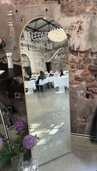 Setzen Sie stilvolle Akzente auf Ihrer Veranstaltung mit unserem hochwertigen, personalisierbaren Spiegel. Ob als Willkommensschild oder Sitzplan. Gestalten Sie den Spiegel ganz nach Ihren Wünschen, mit Namen, Datum oder einer persönlichen Botschaft. Dank des minimalistischen und eleganten Designs ist ein echter Hingucker auf Ihrer Veranstaltung. Mit unserer Spiegel schaffen Sie nicht nur ein dekoratives Highlight, sondern auch eine stilvolle Möglichkeit, Ihre Gäste willkommen zu heißen.