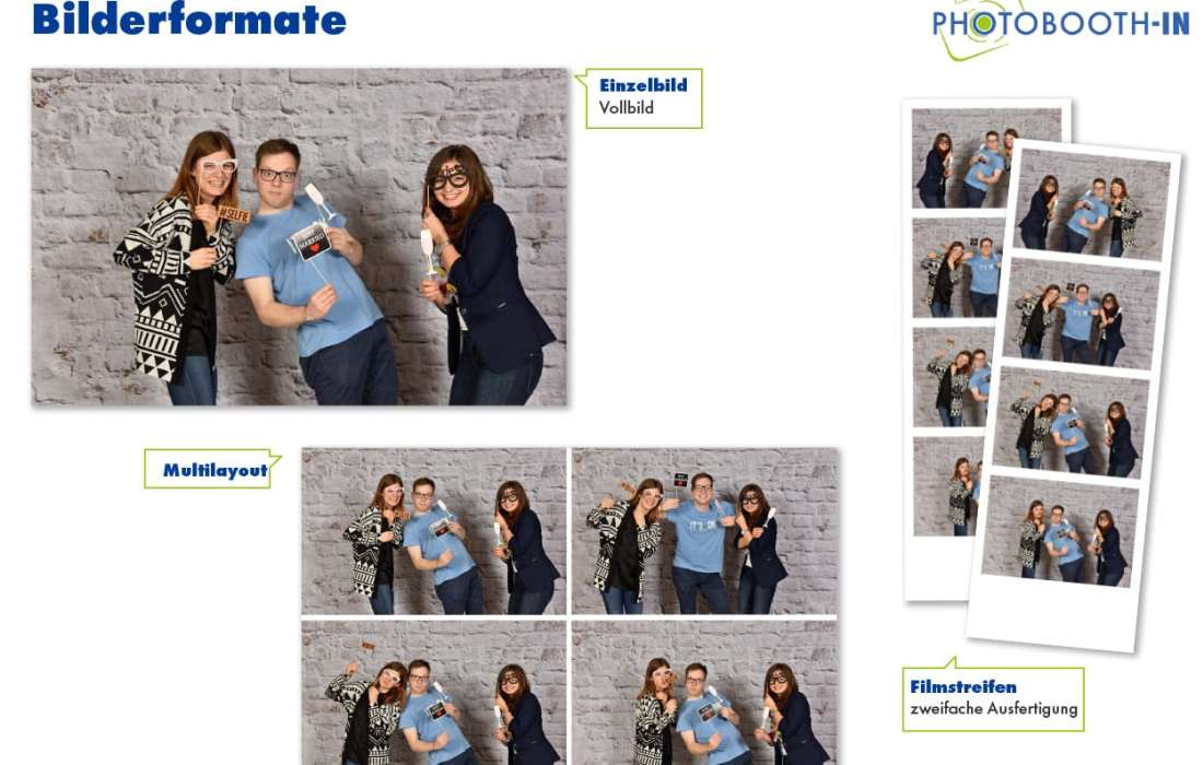 Als besonderes Highlight haben Sie und Ihre Hochzeitsgäste vor jeder Aufnahme die Chance sich ein neues Bildformat auszusuchen. Durch die direkte Auswahl am Touchbildschirm können Sie sich dann über ein Einzelbild, einen Fotostreifen oder ein 4er-Foto freuen. Darüber hinaus können Sie sich zwischen einem farbigen oder einer schwarz-weiß Foto entscheiden.