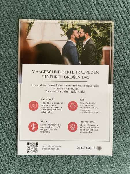 Aus eigener Erfahrung weiß ich, wie wichtig die richtige Traurede für die eigene Hochzeit ist und habe deshalb die Zeilenfabrik gegründet. Ich komme aus Hamburg, bin aber in ganz Norddeutschland im Einsatz und würde mich sehr freuen, auch eure Geschichte erzählen zu dürfen.