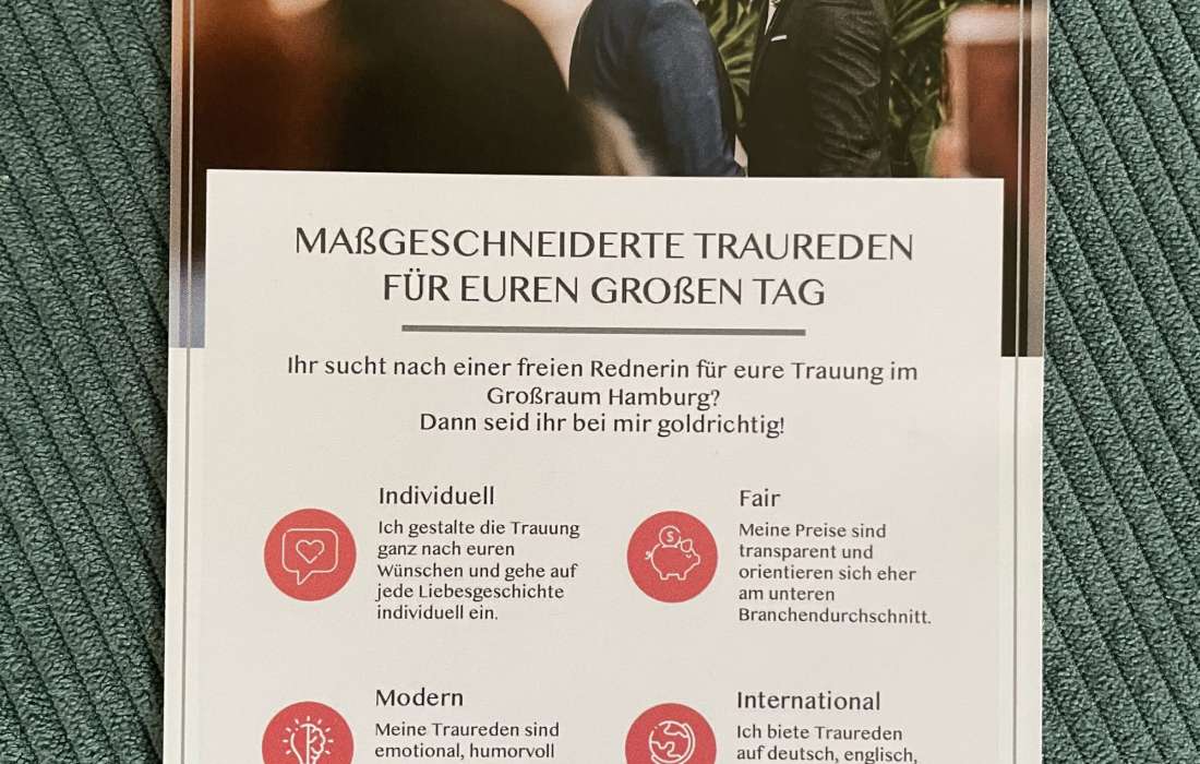 Ich biete moderne und individuelle Traureden, die unterhalten, lange im Ohr bleiben und garantiert kein Auge trocken lassen.
