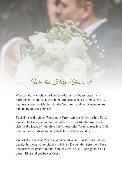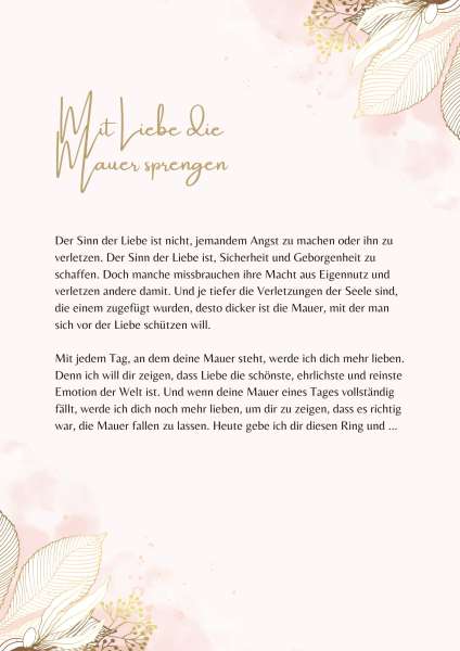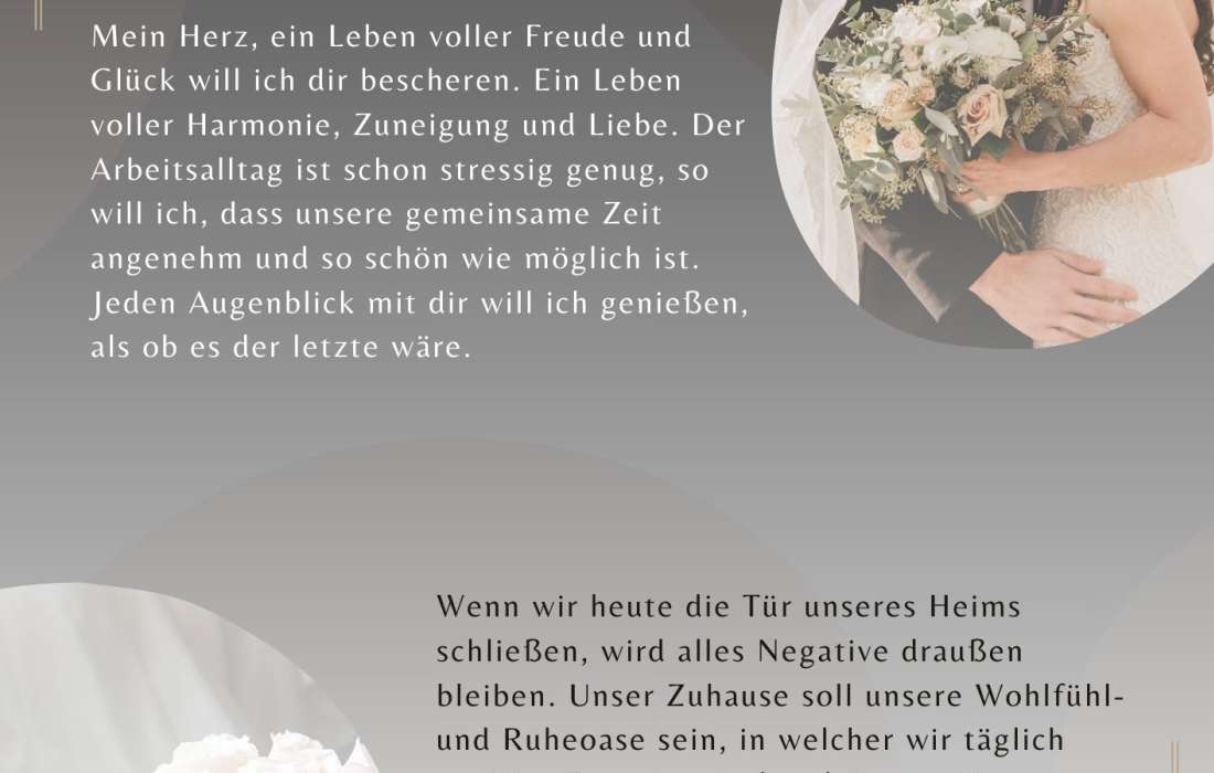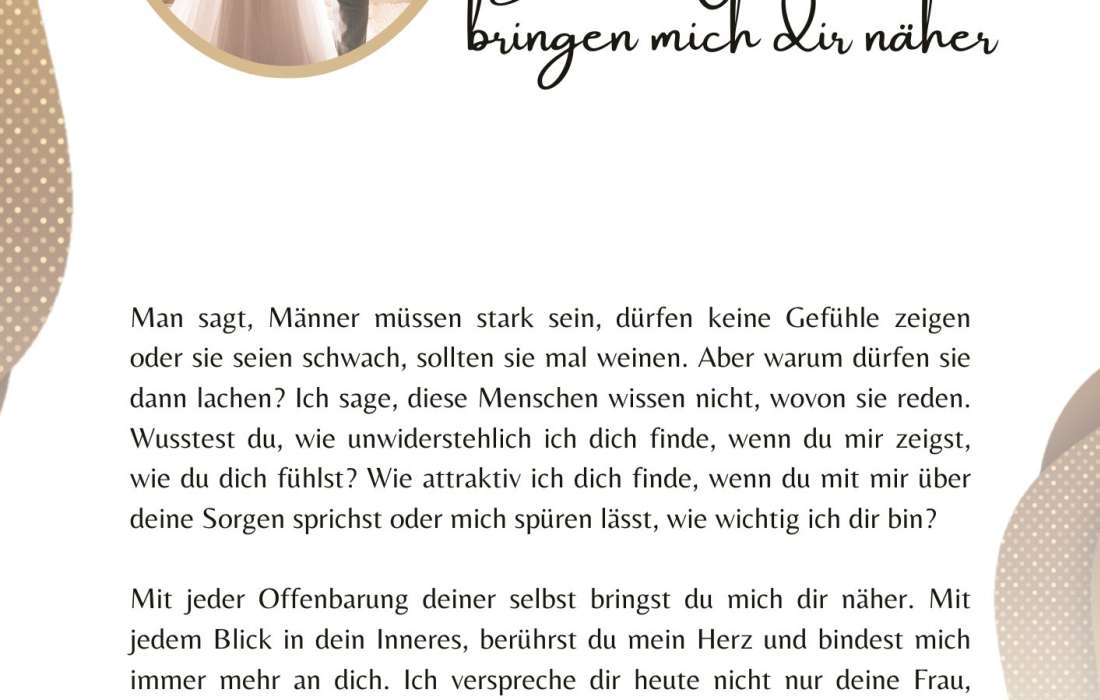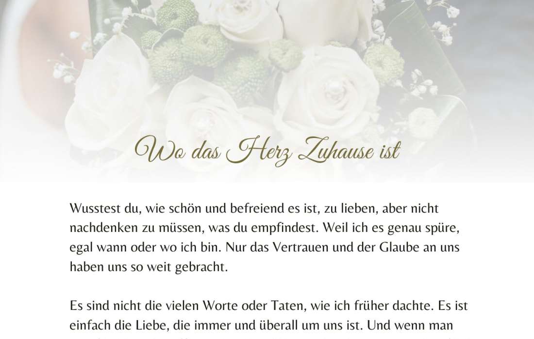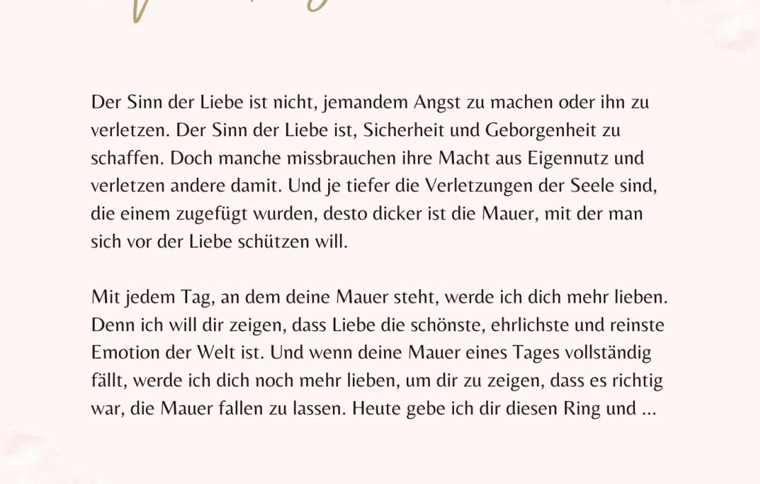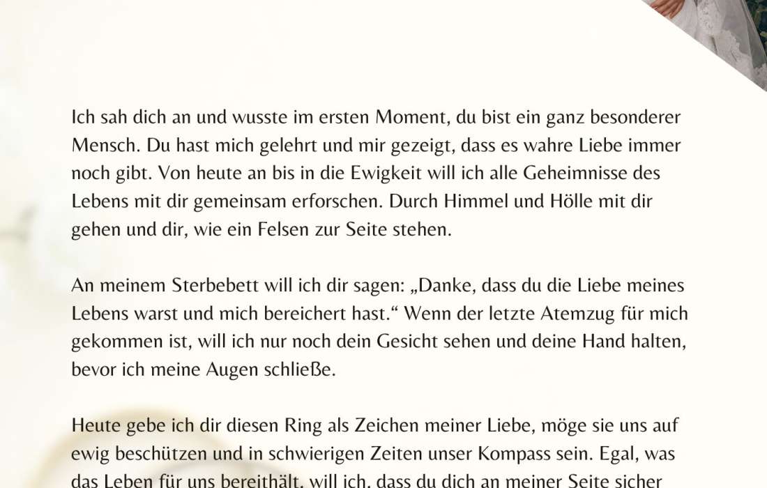 Bist du gerade dabei zu heiraten oder einen Heiratsantrag zu machen? Für die besonders wichtigen Anlässe bin ich für dich da und unterstütze dich gerne, die richtigen Worte für dein Eheversprechen, deine Hochzeitsrede oder Liebeserklärung zu finden. Egal, ob ihr euch für eine freie, kirchliche oder standesamtliche Hochzeit entscheidet, deine persönliche Rede passe ich individuell an eure Hochzeit und Trauung an.