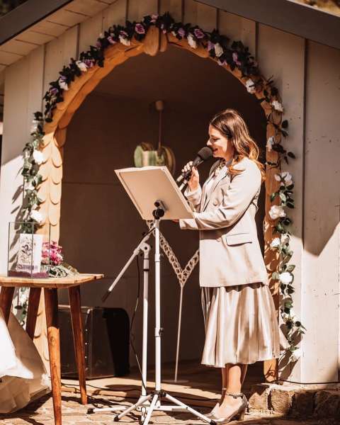 Der Beruf der Schauspielerin ist so vielseitig, dass ich mich dazu entschieden habe, nicht nur auf der Bühne zu stehen, sondern auch als freie Rednerin tätig zu sein. Ich freue mich jedes Mal sehr darüber, durch eine Trauzeremonie führen zu dürfen. Sie, das Brautpaar und Ihre Liebe zueinander, sind der zentrale Punkt, um den es sich an diesem besonderen Tag dreht!