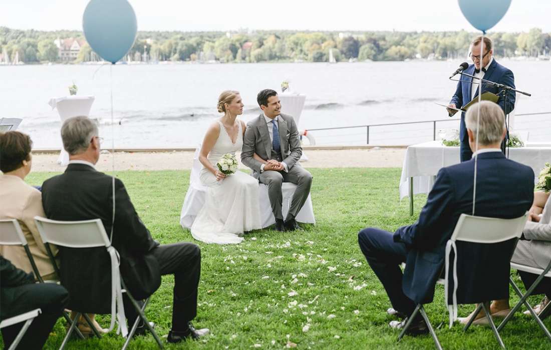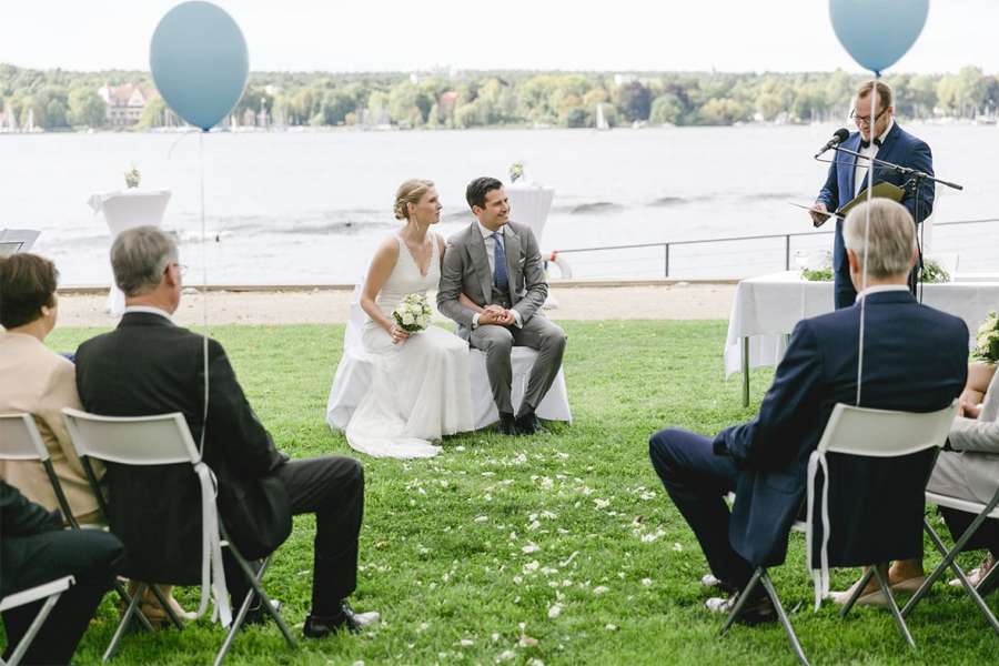 Lieber Marco, wir danken dir von ganzem Herzen, dass du unsere Freie Trauung am Haus Sanssouci mit Blick auf den Wannsee perfekt gemacht hast. Diese fand aufgrund des Regens nicht im Garten, sondern auf der großen Dachterrasse statt. Nachdem wir dich bereits auf einer anderen Hochzeit live erleben und bewundern durften, brauchten wir gar nicht erst nach anderen Trauredner*innen Ausschau halten - für uns war klar: Wir wollen einen Profi. Was du aus unserem Vorgespräch gezaubert hast, war einfach nur traumhaft. Unsere außergewöhnlichen Mottos Star Wars, Minions und Züge hast du auf eine gleichzeitig witzige und emotionale Art eingebracht. Wir und alle Gäste konnten durchgehend lachen, weinen oder träumen und das Feedback von unseren Familien und Freunden spricht eine eindeutige Sprache: Der Trauredner war einfach klasse! Ganz klare Weiterempfehlung an alle, die ebenso ihre umwerfende Hochzeit stets in Erinnerung behalten wollen. Die glückliche Braut schaut sich noch 6 Wochen nach der Hochzeit fast jeden Tag einige Videos der Freien Trauung an. Liebste Grüße, die Buddies ♥