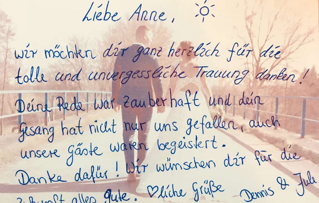 Mein Name ist Anne Fraune und ich bin Traurednerin und Sängerin aus Berlin und freue mich sehr darauf euch und eure Geschichte kennen zu lernen.