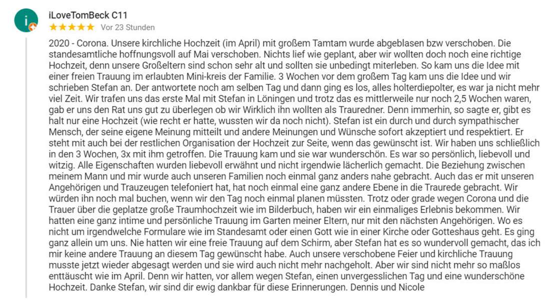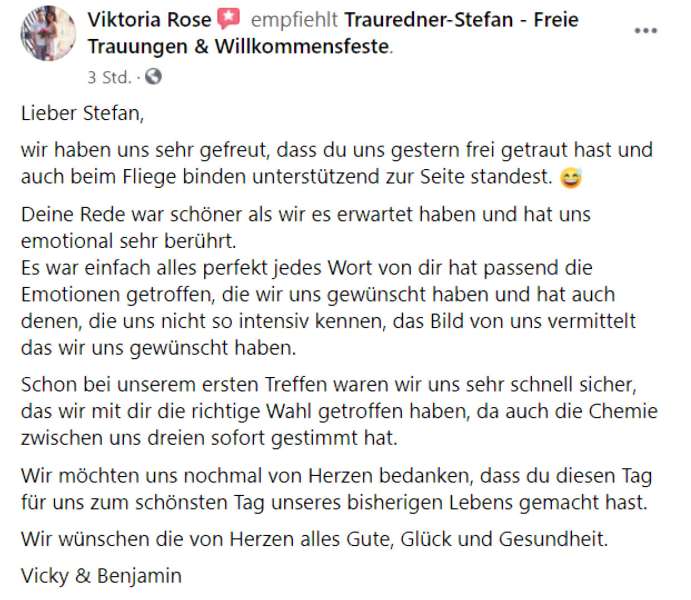 Ich möchte mit meinen Worten und meiner Unterstützung Euren ganz besonderen Anlass zu einem ganz besonderen, unverwechselbaren und vor allem unvergesslichen Tag machen.