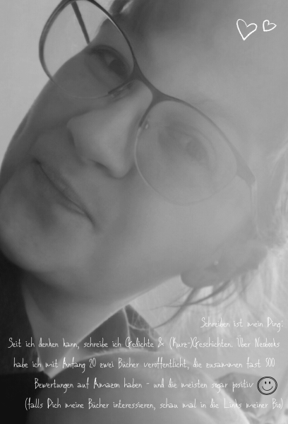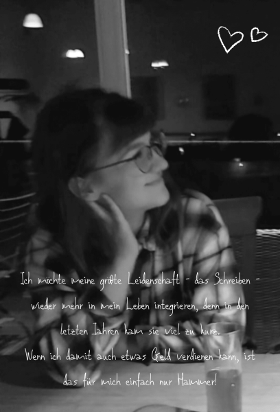 Schon immer liebe ich das Lesen & Schreiben - meine ersten Geschichten habe ich mit etwa 7 Jahren geschrieben, in einer meiner ersten mussten meine Familie & ich vor mutierten Riesen-Bienen fliehen (wir haben es alle überlebt). Inhaltlich inzwischen etwas anders aufgestellt, liebe ich das Schreiben und auch das Lesen noch immer. Worte, Zitate, Bücher, Zeitungen, Reden, Songtexte ... Egal was, ich möchte es konsumieren! Worte erfüllen einfach mein Herz, selber kreative Texte zu schreiben, und sei es nur auf der Geburtstagskarte, macht mir verdammt viel Spaß.