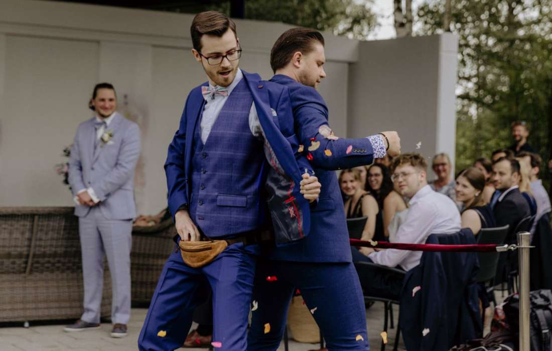 Wenn ich eine Hochzeit fotografiere, mische ich mich unnauffällig und locker mit unter die Gesellschaft, fange auch hier und da mal ein Gespräch an und stehe niemandem im Licht oder im Weg. Auf diese Weise kann ich sehr viele natürliche und vor allem ungestellte Fotos schießen und echte Momente festhalten.