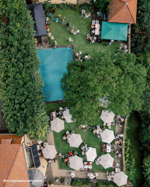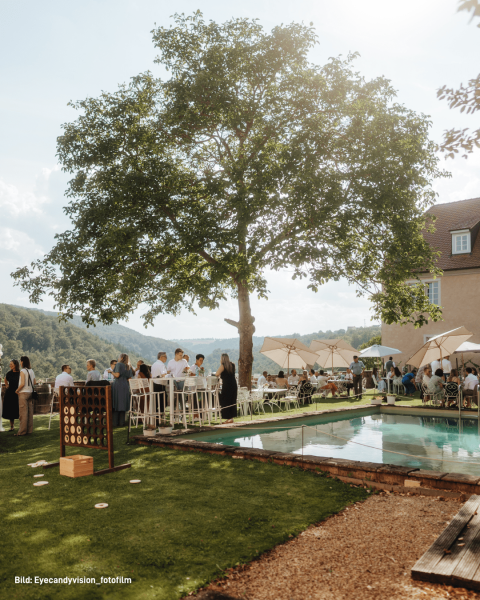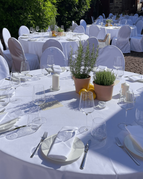Unsere Location verbindet rustikalen Charme, eine atemberaubende Aussicht und unglaublich viel Gestaltungsspielraum. Ob romantische Trauung im Garten, Sektempfang und Dinner im Innenhof oder Party im Gewölbekeller – ihr entscheidet, wie euer Tag aussehen soll. Und falls das Wetter nicht mitspielt: Kein Problem, wir haben immer einen stilvollen Plan B.