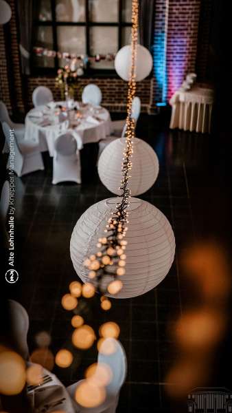 Die rustikale Alte Lohnhalle mit ihrer einmaligen Atmosphäre rundet unser Angebot für Hochzeiten ab. Sowohl mit 150 Personen als auch 50 Personen finden Sie bei uns die passenden Räumlichkeiten. Setzen Sie die Location mit LED-Strahlern auf der oberen Empore, sowie an den Säulen, besonders in Szene. Lichterketten über den Köpfen der Gäste und Lichternetze tragen zur besonderen Atmosphäre bei.