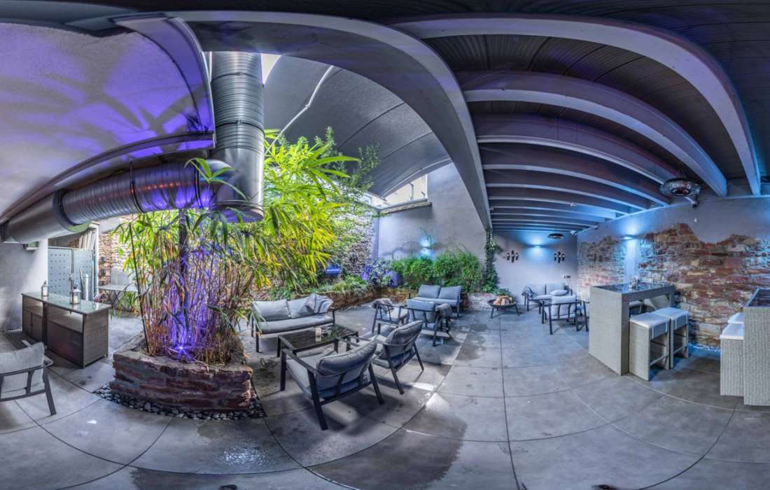 Historische Natursteinwände kombiniert mit Fabrik-Chic in Form von Beton, Edelstahl und Leder prägen diese außergewöhnliche Location, perfekt kombiniert mit einem der schönsten Gastro-Gärten der Stadt.