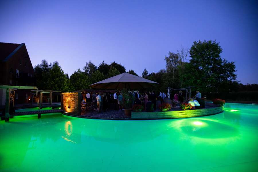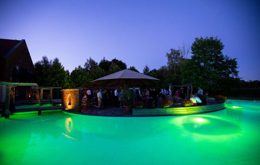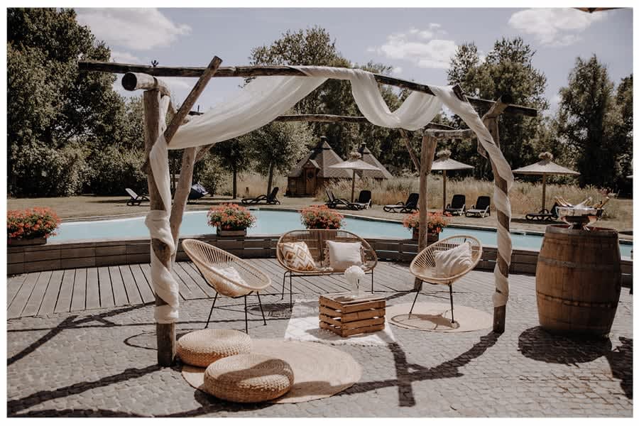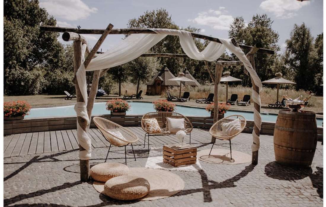 Für Freie Trauungen bieten wir ein traumhaftes Ambiete auf der Insel im Pool oder romantisch in einer Wildblumenwiese, dank dem großen Boho Zelt wetterunabhängig.