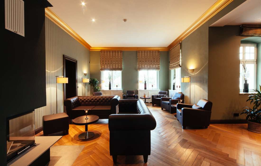 Der Empfangsbereich und das Kaminzimmer laden zum Verweilen und Entspannen ein. Hier können Sie sich bei einem Glas Wein vor dem knisternden Feuer zurücklehnen und die Atmosphäre dieses historischen Ortes genießen.