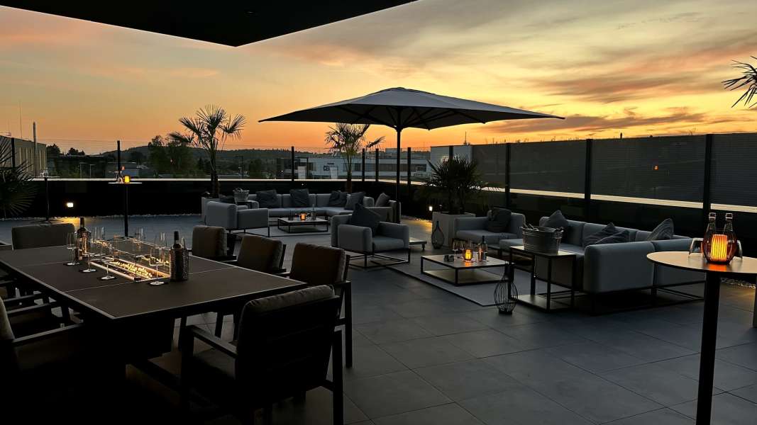 Die gesamte Räumlichkeit ist lichtdurchflutet durch bodentiefe Fenster und eine zentrale Lichtkuppel. Sie genießen Weitblick ins Grüne inklusive traumhafter Sonnenuntergänge.