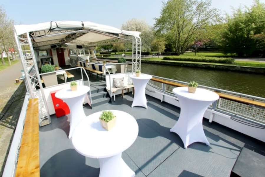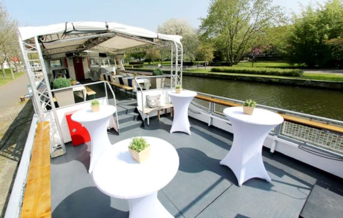 Ein Highlight der Ruhrperle: Ihr großzügiges Freideck, das auf zwei Ebenen bei Bedarf komplett überdacht wird. Der helle Lounge-Bereich im Unterdeck kann als Tanzfläche oder Buffetbereich genutzt werden, hinzu kommt ein gut ausgestatteter Barbereich. Zusätzlich ist das gesamte Schiff mit moderner Licht- und Soundtechnik ausgestattet – ein toller Rahmen für eure maritime Hochzeit in NRW.