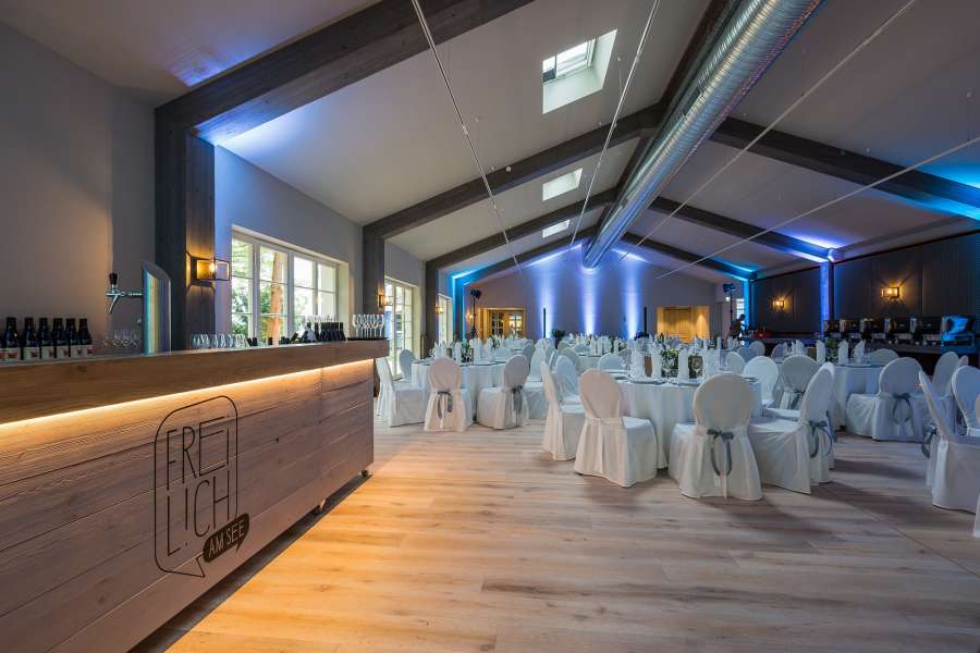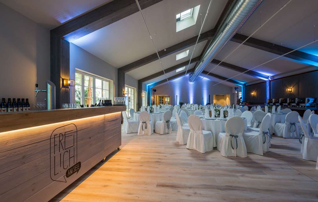Idyllisch gelegen im Cecilienpark und direkt am Ufer des Scharmützelsees bieten wir Euch den idealen Ort für Eure Traumhochzeit am See. Zur Räumlichkeit gehören unser großer, lichtdurchfluteter Eventsaal, eine Außenterrasse sowie ein exklusiver Park. Auf unserer großzügigen Hochzeitswiese habt Ihr die Möglichkeit euch im Kreise Eurer Liebsten frei trauen zu lassen. Auch die Fläche des Cecilienparks und die dortige Anlegestelle kann für eine freie Trauung genutzt werden. Die Veranstaltungsfläche ist individuell gestaltbar und verfügt über professionelle Licht- und Tontechnik. Unser Gasthaus kann ebenfalls als Veranstaltungsfläche, komplett oder zu Teilen, gebucht werden. Die modern eingerichtete, bayerische Stube bietet eine gemütliche Atmosphäre insbesondere für kleinere Hochzeitsfeiern.