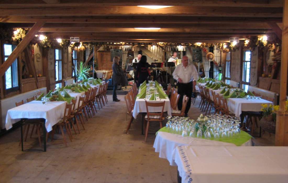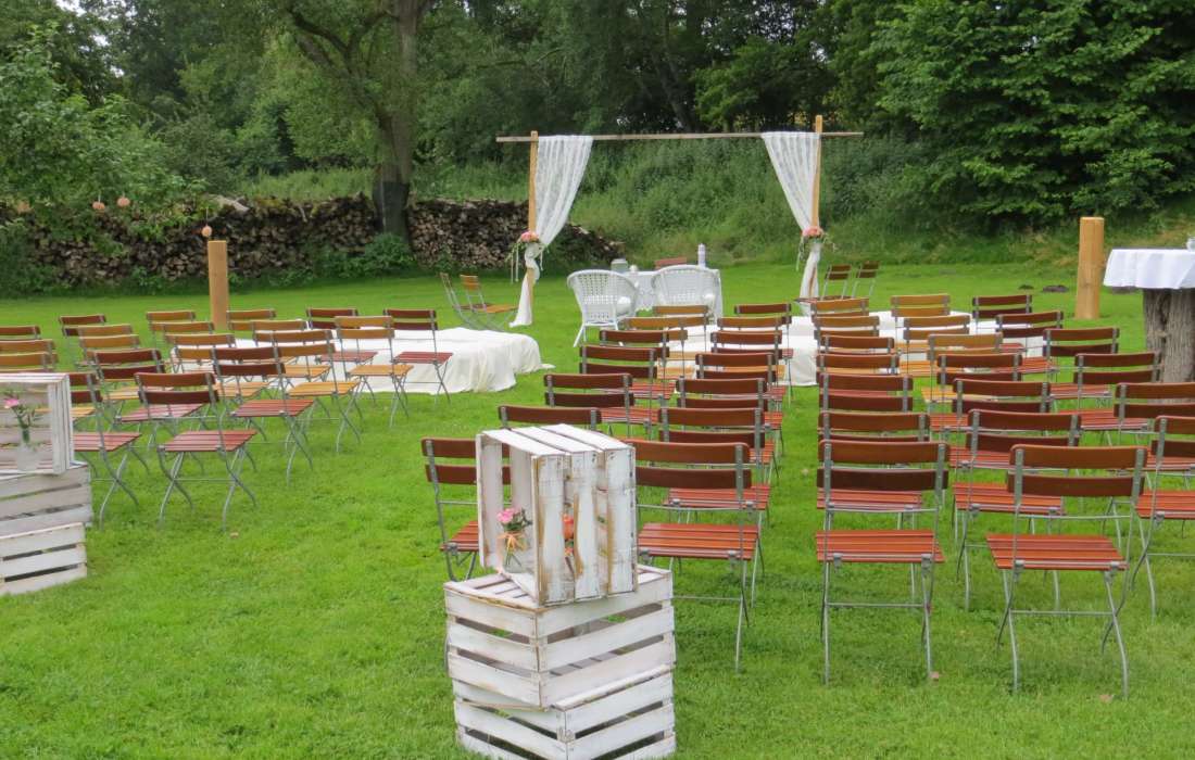 Auf unserem idyllischen, verträumten Festgelände mit angrenzendem Mühlbach und Spielwiese, weit ab von Lärm und Hektik, kommen große und kleine Leute auf Ihre Kosten.