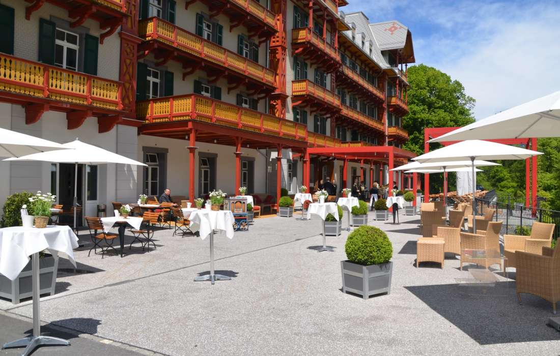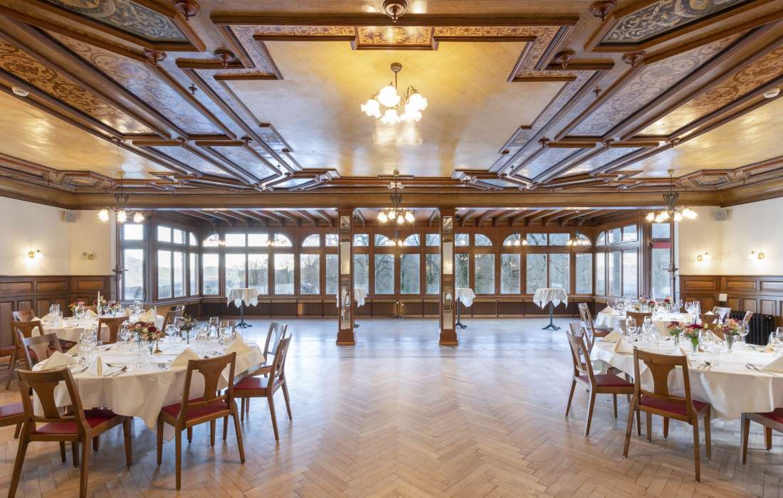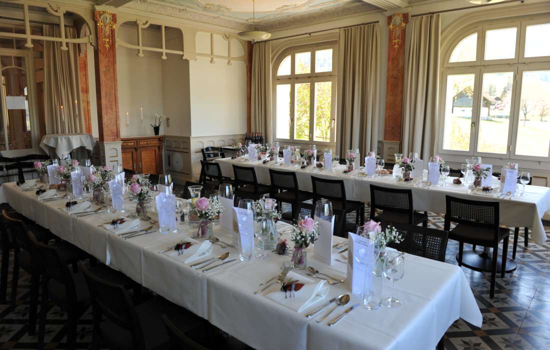 | Erklärung zur Gästezahl | Historischer Speisesaal (bis 150 Personen); Gartensaal (bis 80 Personen); Huetstock, Nünalphorn, Widderfeld (je bis 25 Personen); Großer Salon (bis 30 Personen); Kleiner Salon (bis 10 Personen); Damensalon (bis 16 Personen); Restaurant Veranda (bis 120 Personen) |