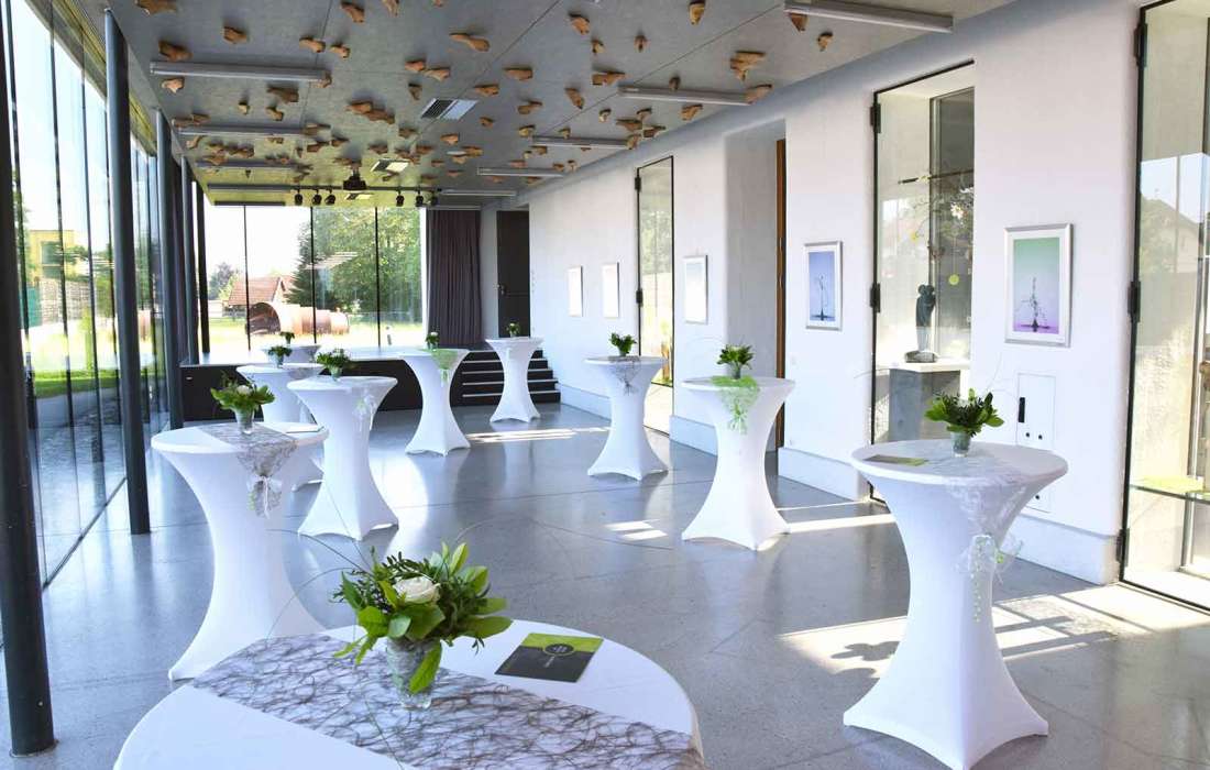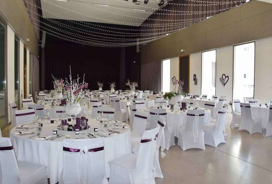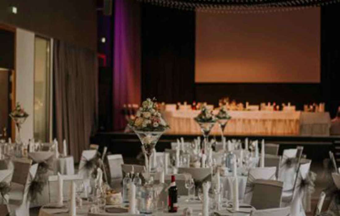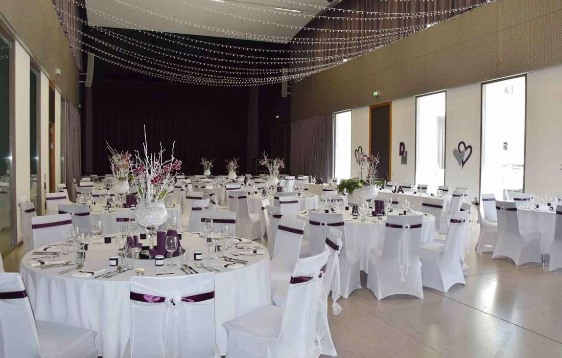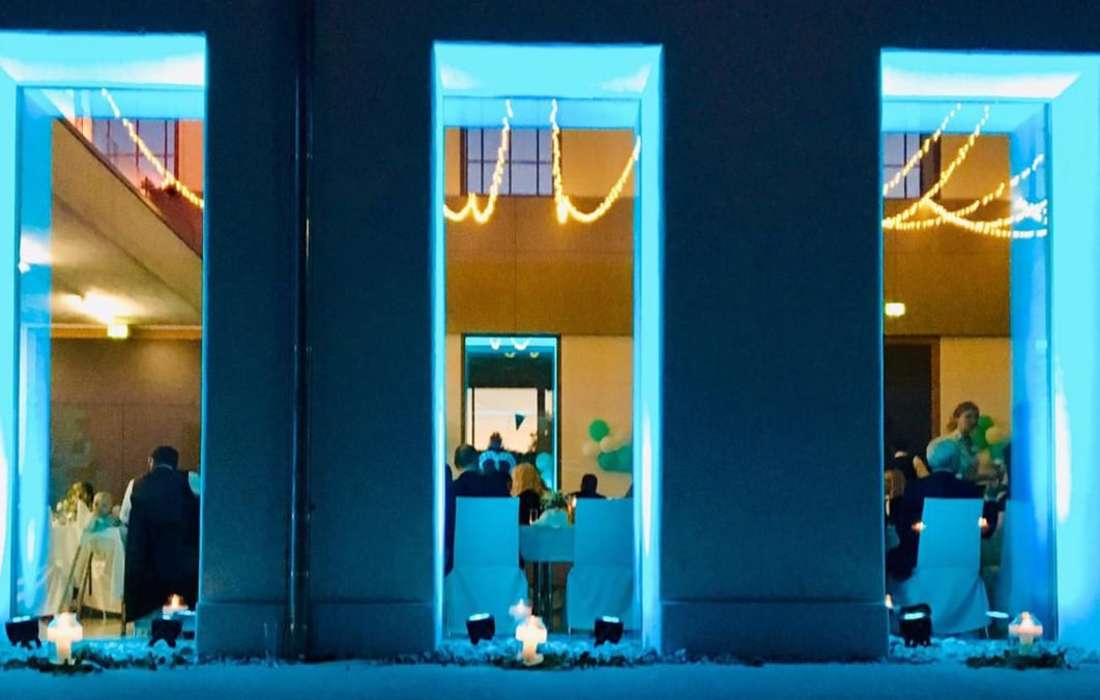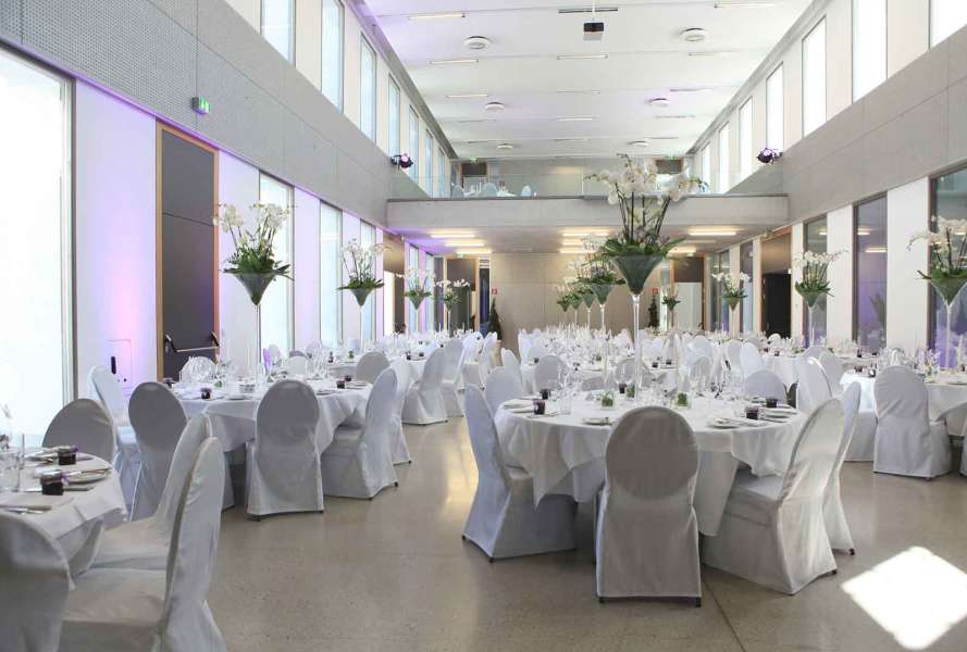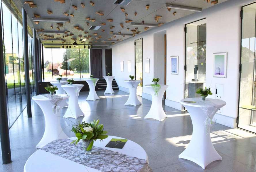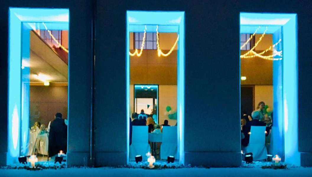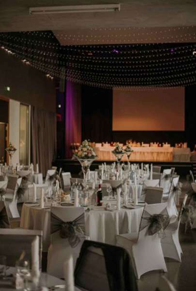Der stilvolle Festsaal überzeugt durch Modernität und Eleganz. Ein Highlight ist die großzügig angelegte Fensterfront, die den Einfall vonTageslicht begünstigt und so den Saal hell und freundlich wirken lässt.
