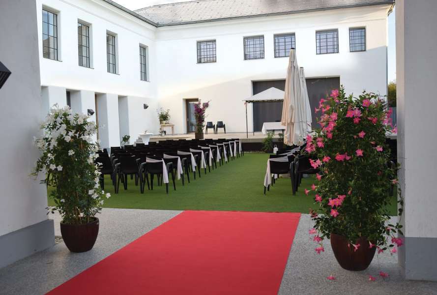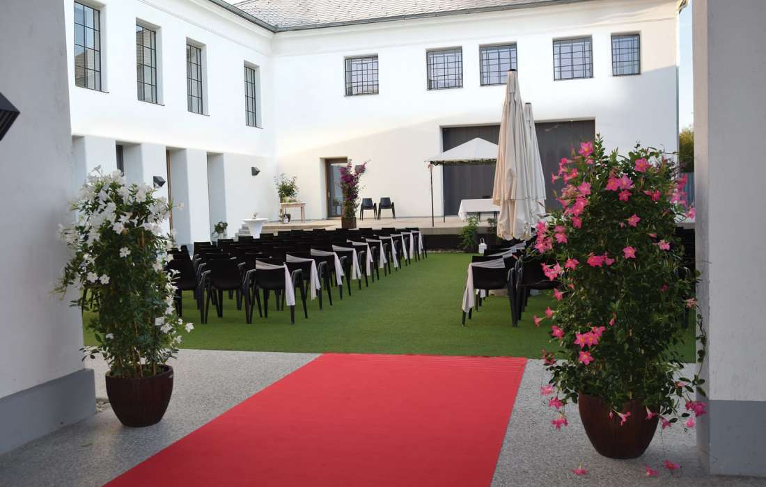 Der traumhafte Innenhof besticht durch seine Vielseitigkeit. Eine standesamtliche oder freie Trauung, ein klassischer Empfang oder ein Tanz bei Mondschein – all diesen Ideen sind keine Grenzen gesetzt.