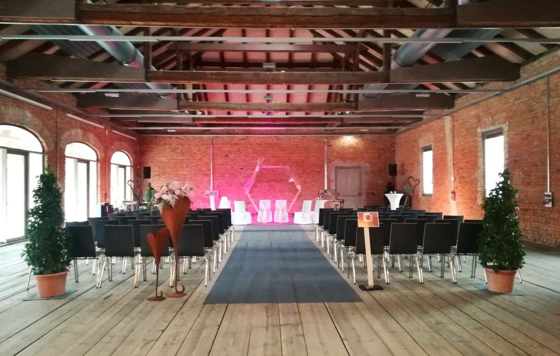 Der atemberaubende Fabriksaal – kann nicht in Worte gefasst werden. Die Backsteinoptik und die antiken Holzdielen sorgen für ein warmes und rustikales Ambiente, dass zum Verweilen einlädt. Der Fabriksaal ist die perfekte Kulisse bei standesamtlichen und freien Trauungen.