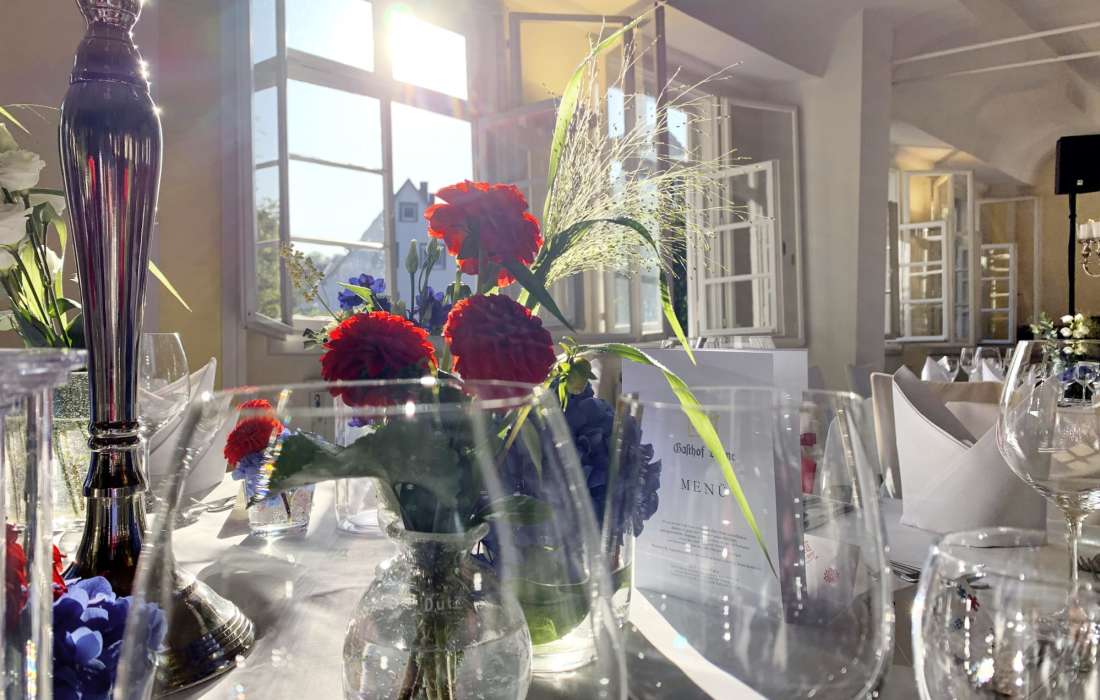 Mit dem romantischen Saal, dem gemütlichen Restaurant und der wunderschönen Gartenterrasse ist unser Haus der ideale Ort für Ihre Hochzeit, denn wir bieten für jede Gästeanzahl die passende Räumlichkeit. Nur wenige Gehminuten entfernt gibt es gleich mehrere Traumöglichkeiten.