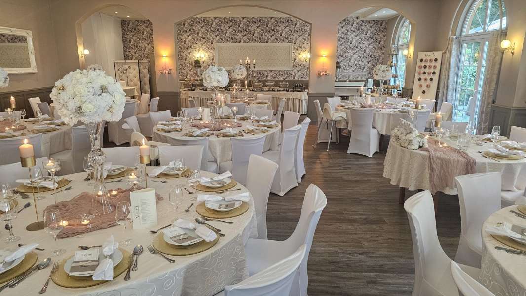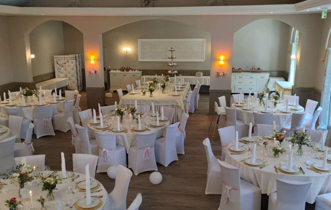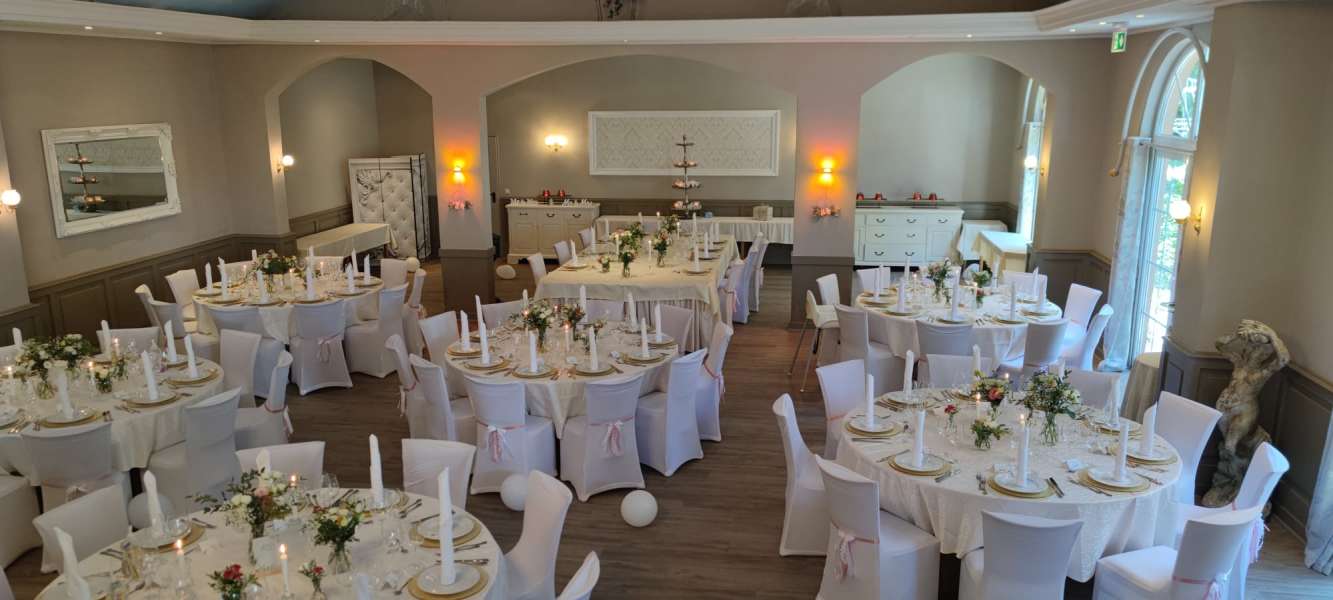 Unser großer Veranstaltungssaal "Schloßterrasse" bietet Platz für bis zu 250 Gäste und ist der ideale Ort für Ihre Traumhochzeit. Ob als Hochzeitssaal oder für andere festliche Anlässe wie Geburtstage, Jubiläen oder Betriebsfeiern – hier wird jede Feier zu einem besonderen Erlebnis.