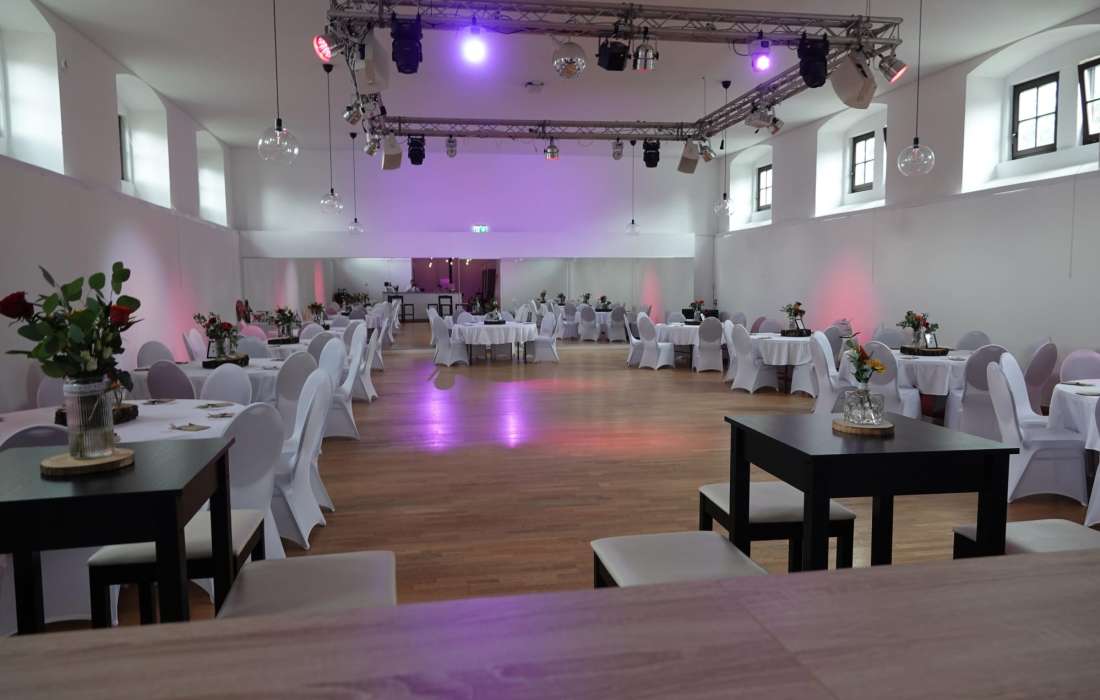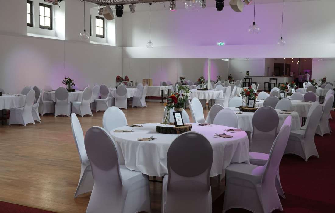 Unsere flexible Raumgestaltung erlaubt es, den Saal ganz nach Ihren Wünschen zu gestalten – ob für eine feierliche Tafel oder einen großen Tanzbereich. Dazu bieten wir Ihnen 150 komfortable Sitzplätze und Tische an, die je nach Eventkonzept arrangiert werden können.