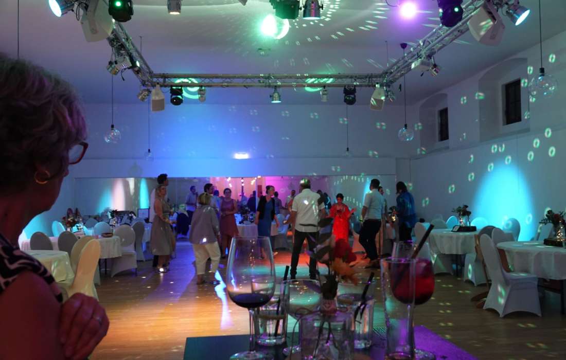 Ein besonderes Highlight ist unsere erstklassige Sound- und Lichtanlage, die an einer Traverse installiert ist und für beeindruckende Lichtstimmungen sowie den perfekten musikalischen Rahmen sorgt. So wird Ihre Hochzeit nicht nur ein Fest für die Augen, sondern auch für die Ohren. Ob dezente Hintergrundmusik oder stimmungsvoller Party-Sound – wir sorgen dafür, dass Ihre Feier unvergesslich wird.