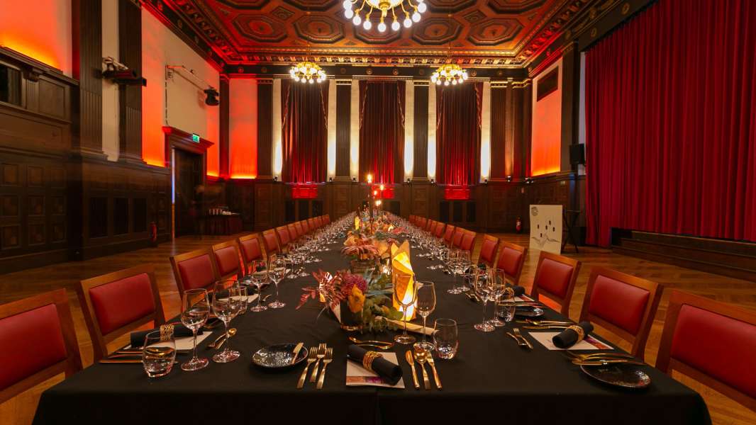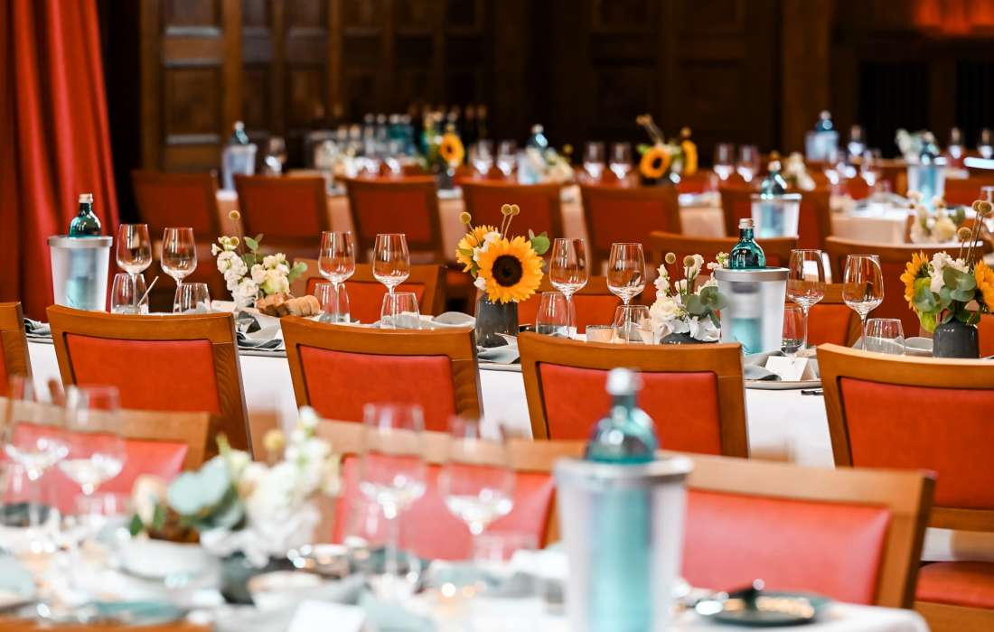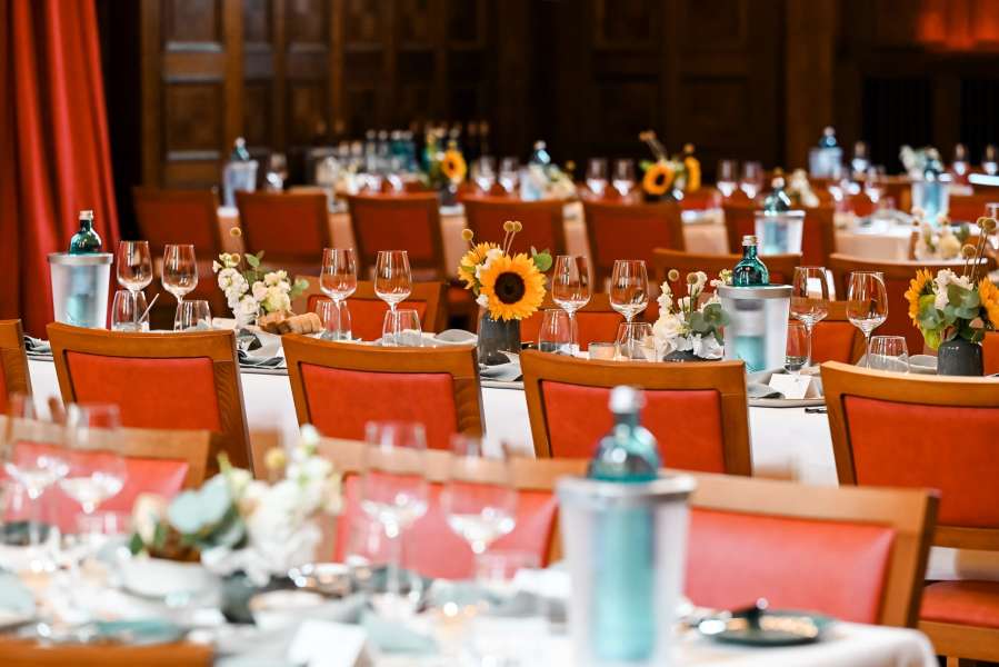 Der 266 m² große Meistersaal mit sieben Metern Deckenhöhe, kunstvoller Kassettendecke, edlem Parkett und funkelnden Kronleuchtern bietet Platz für romantische Hochzeiten im kleinen Kreis ebenso wie für festliche Gala-Hochzeiten mit bis zu 220 Gästen. Die feste Bühne eignet sich perfekt für Live-Musik, Reden oder besondere Programmpunkte, während die hervorragende Akustik für eine stimmungsvolle Atmosphäre sorgt.