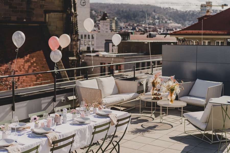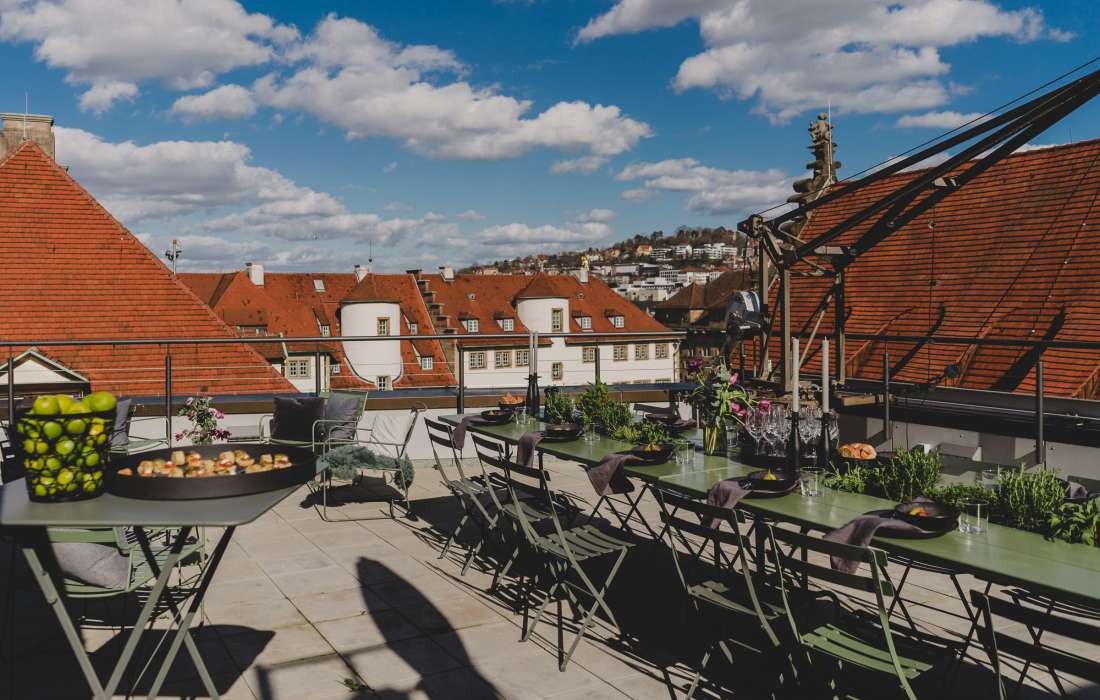 Unsere Location befindet sich direkt neben der Stiftskirche im 4.OG. Über eine Treppe innerhalb des Lofts erklimmt man die große Dachterrasse inklusive Wintergarten mit einem wunderbaren Blick über Stuttgart. Ideal für Parties, BBQ und Brunches über den Dächern Deiner Stadt.