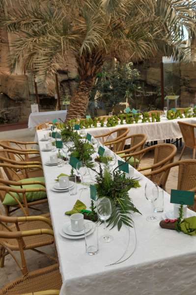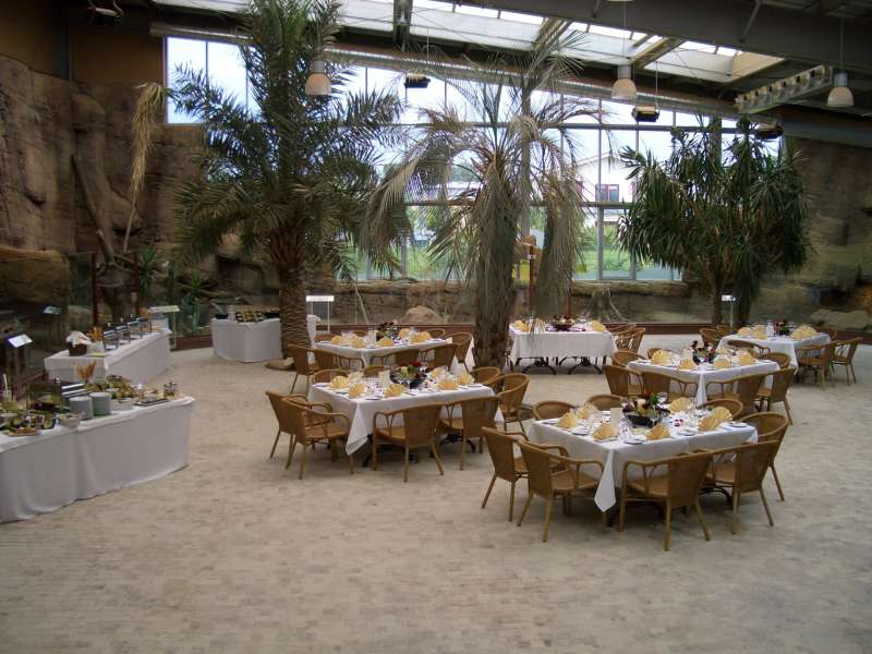 Gefeiert wird dann in der Wüstenhalle, die mit den hohen Felswänden und den offen gestalteten Terrarien jeder Feier das gewisse Etwas verleiht.