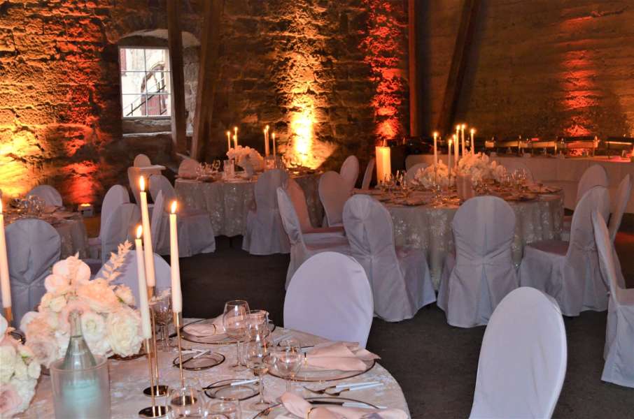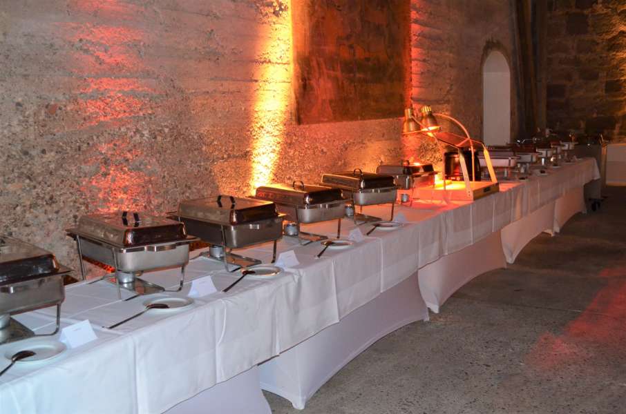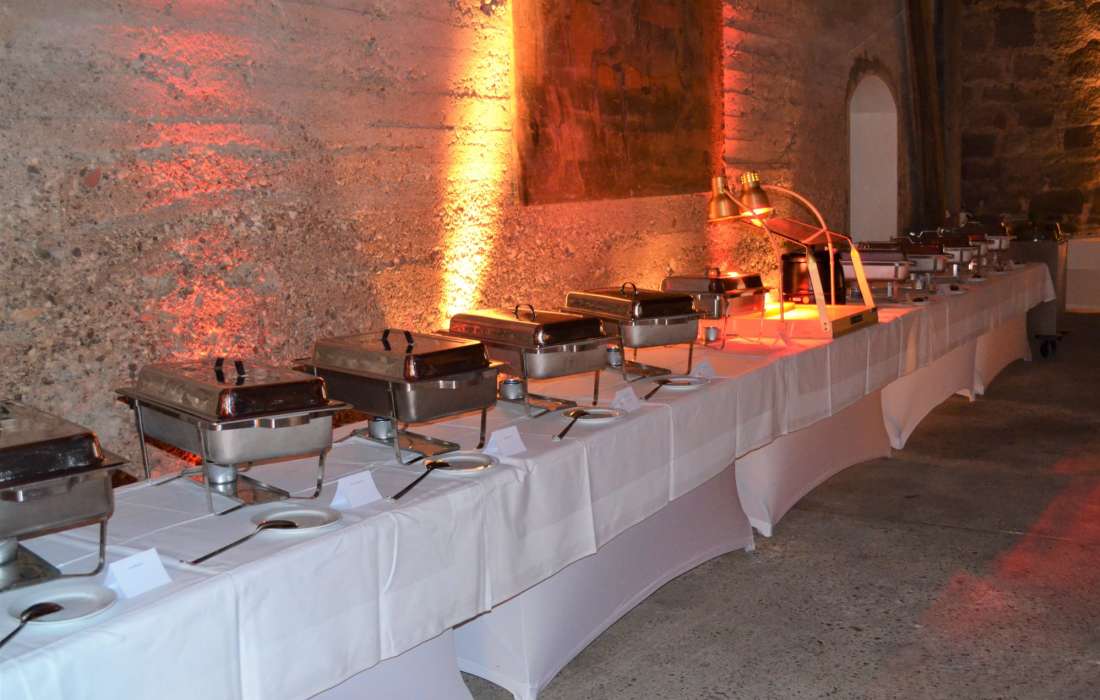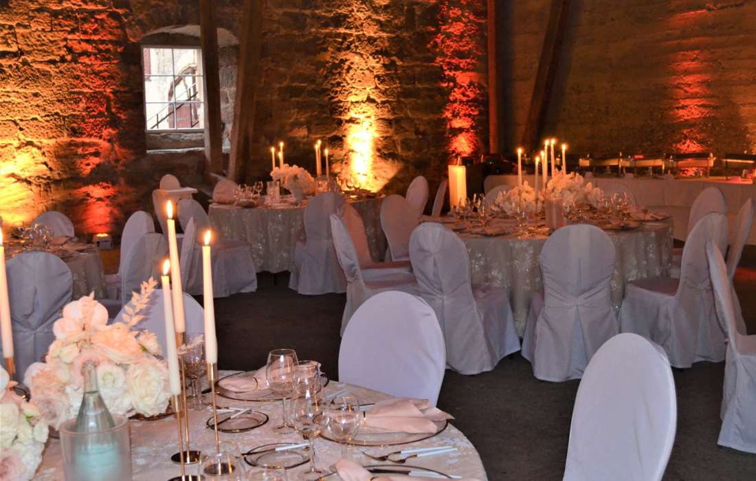 Ideal für 80 bis 180 Personen, egal ob an runden oder eckigen Tischen, mit Buffet oder gesetztem Esssen. Hier steht alles bereit. Eine Liste guter Caterer kann empfohlen werden.