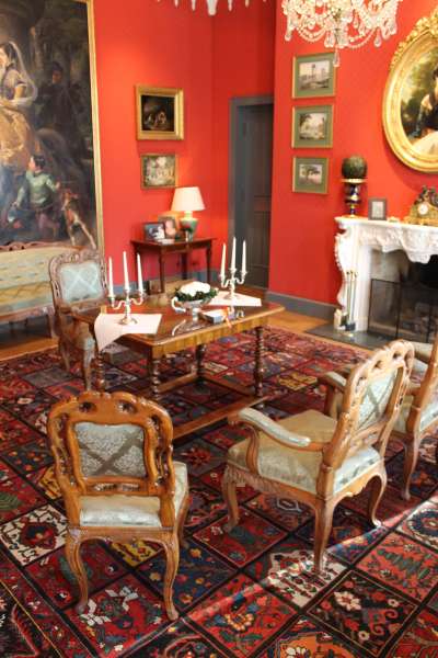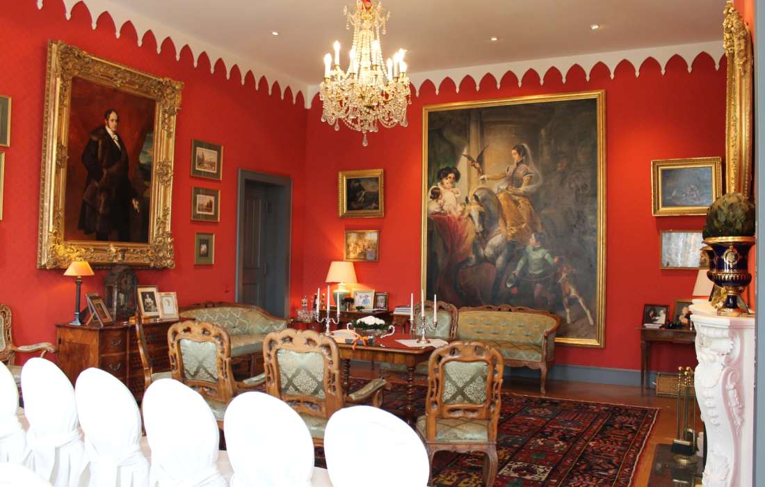 Roter Salon (2. OG): Der Rote Salon in den privaten Gemächern des Sayner Fürstenhauses eignet sich ideal für kleinere Gesellschaften (max. 25 Gäste). Er begeistert mit seiner wertvollen Ausstattung und drei besonderen Gemälden, die Fürstin Leonilla und Fürst Ludwig zu Sayn-Wittgenstein-Sayn zeigen – porträtiert von den besten Malern ihrer Zeit. Das Fürstenpaar ließ Schloss Sayn im 19. Jahrhundert zum neugotischen Residenzschloss umbauen.