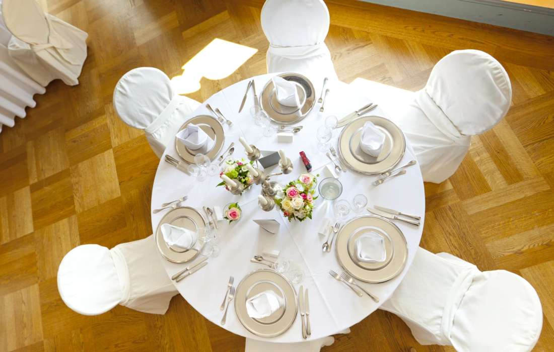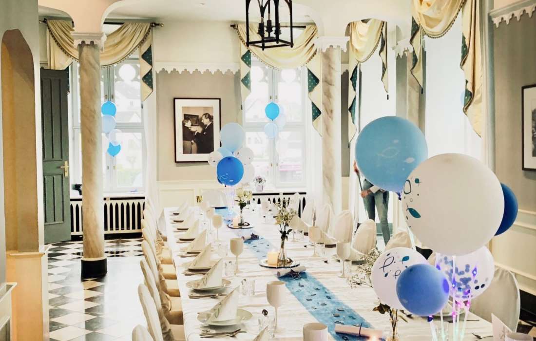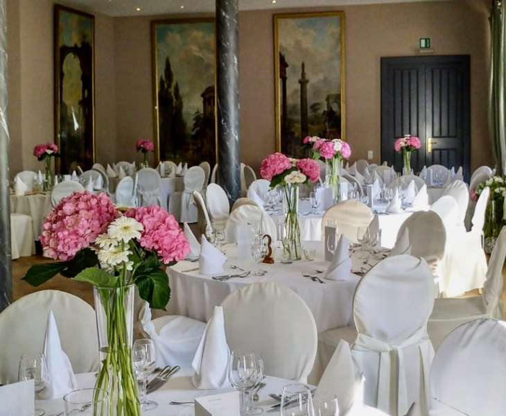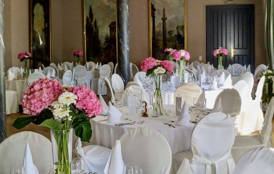 Für elegante Empfänge und festliche Feiern, wie Hochzeiten, Jubiläen oder Geburtstagsfeste, bietet sich der prachtvolle Festsaal an, der mit einem bezaubernden Gartensalon und einer großzügigen Freiterrasse verbunden ist. Nach der Trauung können Sie mit Ihren Gästen auf der Terrasse anstoßen und den atemberaubenden Blick auf den idyllischen Schlosspark genießen.