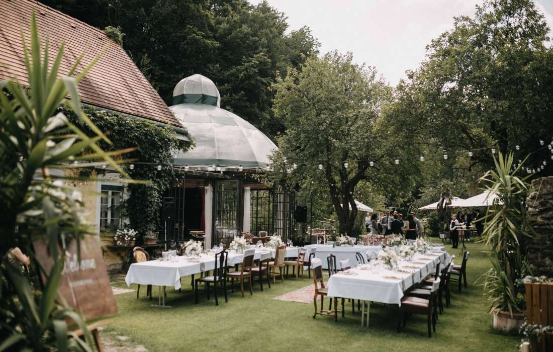 Im wildromantischen Garten direkt am Waldrand und dem Bach, der als Wienfluss bekannt ist, haben sich schon viele Brautpaare das Ja-Wort gegeben.