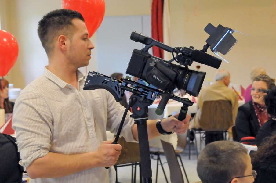 - 1 ein Kameramann mit zwei Kameras (für Totalen und Gegenschüsse – beim Schnitt wird der Film dann lebendiger und abwechslungsreicher), plus großes Stativ für Schwenks in Kinoqualität, plus mehrere Scheinwerfer, plus mehrere Mikrophone (um den Ton überall gut zu erfassen).
