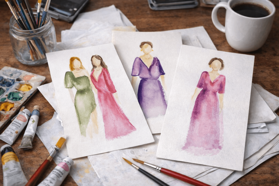 Ich biete Live-Aquarellzeichnungen auf Hochzeiten an und halte eure Gäste in liebevollen, farbigen Paarporträts fest.