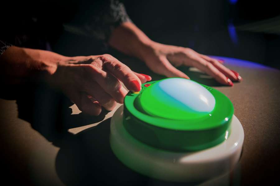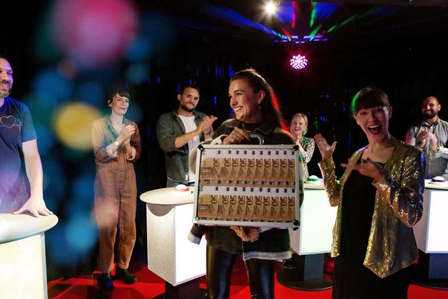 Kein Publikum, keine Kameras, nur ihr und ein Moderator oder eine Moderatorin aus unserem Team. Im Studio 1 haben wir 6 Buzzer-Pulte. Ihr könnt alleine spielen oder auch im Team. Unser Rekord lag bei 5 Personen pro Buzzer.