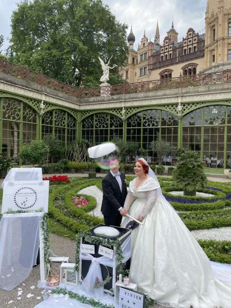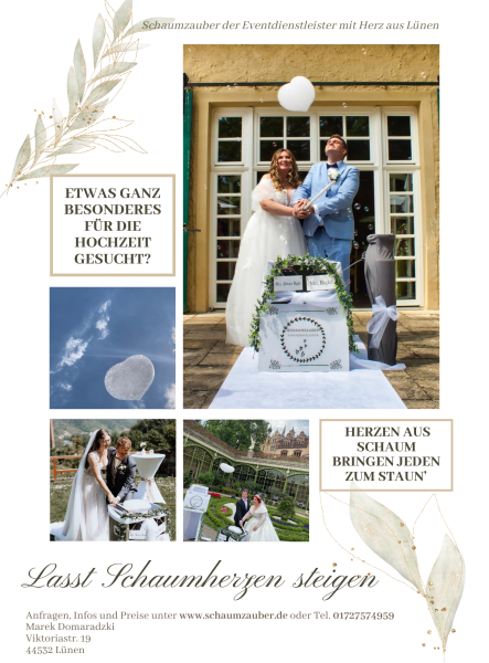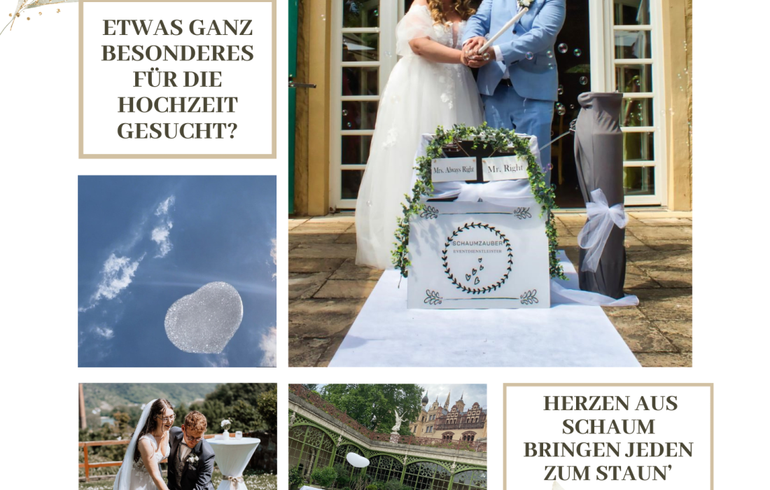 | Besonderheiten / Zusatzleistungen | Fliegende Schaumherzen – lautlos & spektakulär 100 % biologisch abbaubar & umweltfreundlich Ideal bei Ballonverboten & für Outdoor-Trauungen Gänsehautmomente für Brautpaar & Gäste Perfekter Fotomoment – beliebt bei Hochzeitsfotografen Service mit Technik & Betreuung vor Ort Bundesweit buchbar (Startpunkt NRW) |