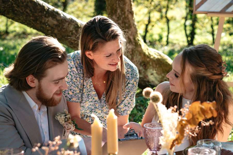 Hochzeitsplanerin bespricht Tagesablauf mit Brautpaar.jpg